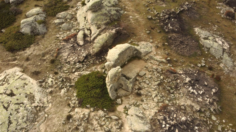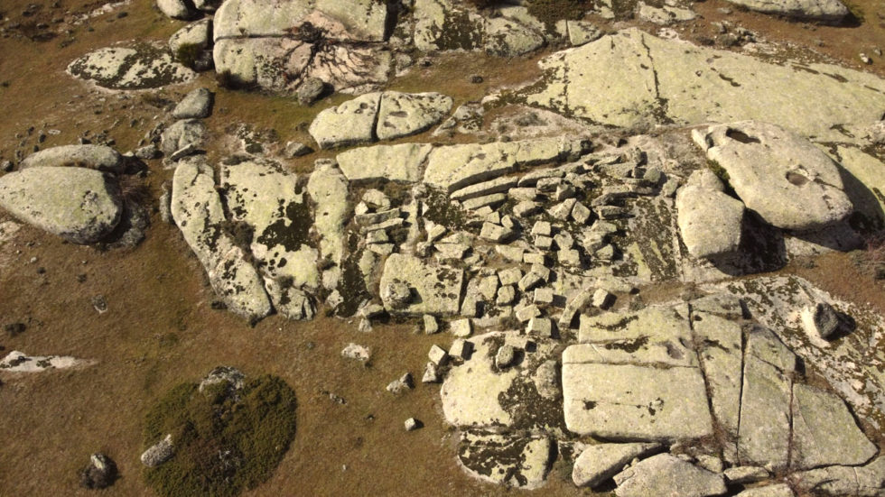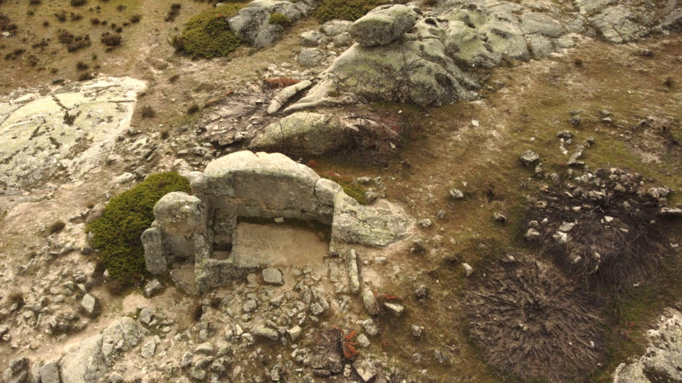 A menos de 100 metros del altar aparece otra curiosa estructura rectangular dividida en tres estancias, dos de ellas separadas por una piedra perforada.