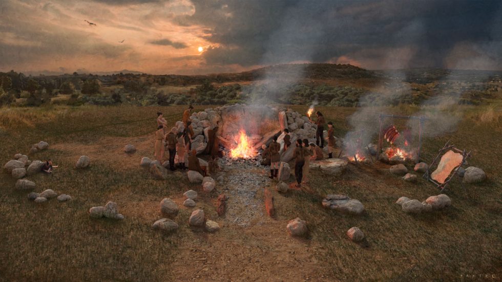 Así, por ejemplo, en el corredor, ocupando todo su ancho, se han recuperado al menos 15 individuos calcinados cuyos huesos formaron en su día una autentica pira funeraria. Al parecer es el resultado de una ceremonia ritual de clausura de la tumba en la que, además, el descubrimiento de ciertos huesos en conexión anatómica permite elucubrar sobre posibles sacrificios humanos.