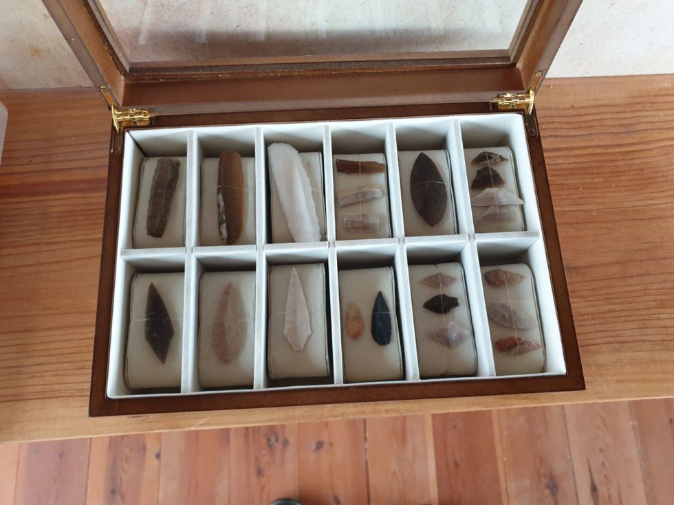 Junto a los restos humanos se han hallado numerosos objetos que integraban el ajuar funerario. Elaborados en sílex podemos citar útiles como, puntas de flecha, microlitos y láminas. Por su parte, entre los elementos de adorno hay cuentas de collar de variscita, de lignito o colmillos de jabalí.