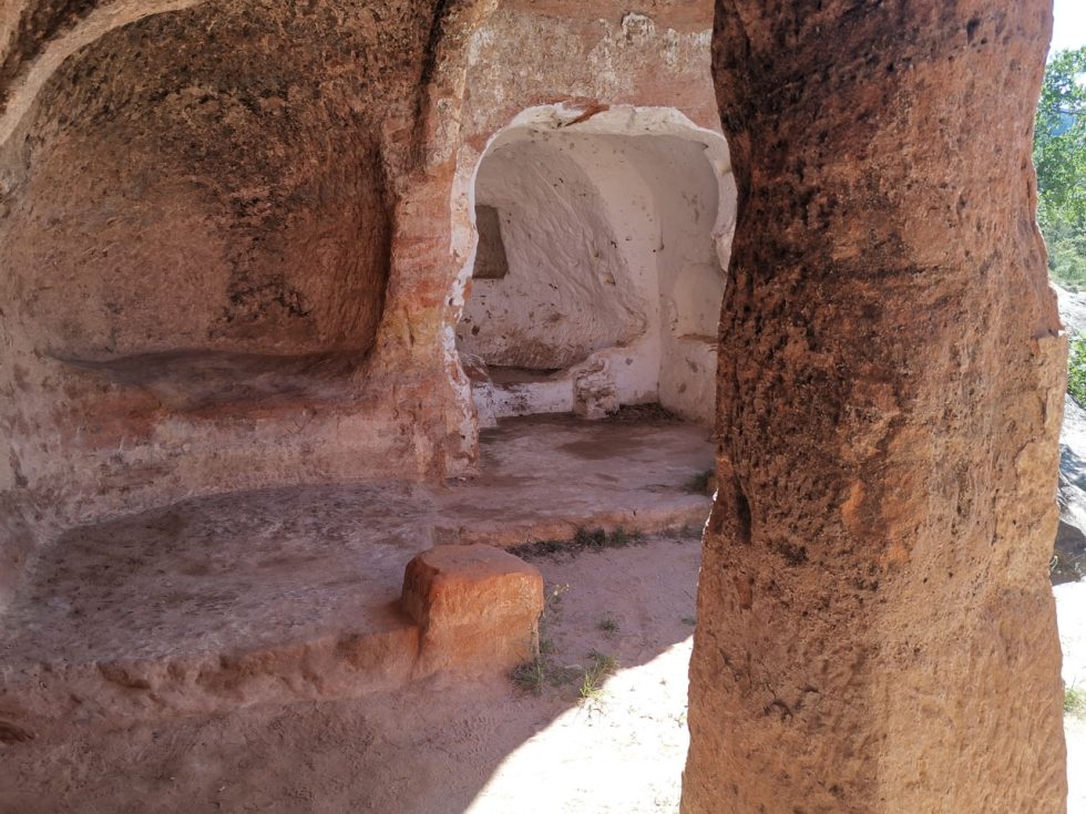 De la iglesia se conserva la cabecera y parte de la nave, en un espacio de algo más de 6 metros de largo por 4 de ancho. La cabecera tiene planta cuadrada y en ella hay un pequeño rebaje en el centro destinado a encajar el altar. Por su parte, la nave dispone de techo en forma de bóveda de medio punto y conserva parte del suelo original de cal, arenisca y ladrillo triturados. En la pared vemos varias oquedades alineadas, orificios para sostener las vigas del coro o piso superior. Igualmente excavado en pared rocosa hay un sarcófago y sobre él una hornacina en forma de arco de herradura.