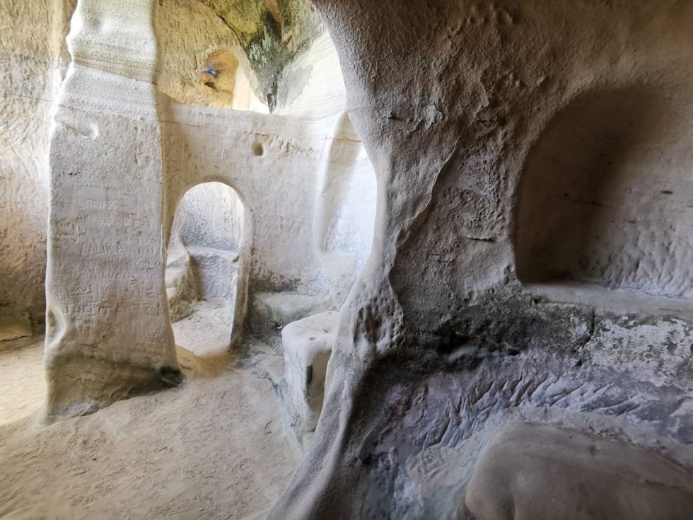En realidad se trata de dos iglesias superpuestas. La inferior tiene planta basilical y tres naves rectangulares que se rematan por tres ábsides, dos de ellos rectangulares y un tercero de planta redondeada. Este último deliberadamente, por razones desconocidas, no se concluyó. Los ábsides tienen tallados respectivos altares y en sus paredes hay oquedades en las que, en uso del templo, se alojarían cruces u otros objetos litúrgicos. La comunicación entre ellos se produce atravesando arcos fajones sostenidos por esbeltas pilastras rectangulares. En el pilar central hay restos del arranque de un muro que pudo funcionar como un cancel que separaba a los sacerdotes de los fieles y, entre estos, a los bautizados de aquellos que no habían recibido el sacramento del bautismo. Por supuesto, permanecían separados en las ceremonias religiosas hombres y mujeres.