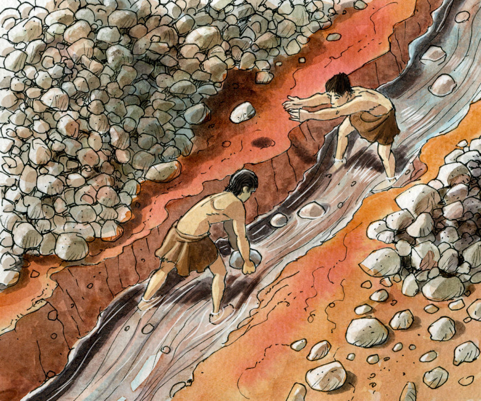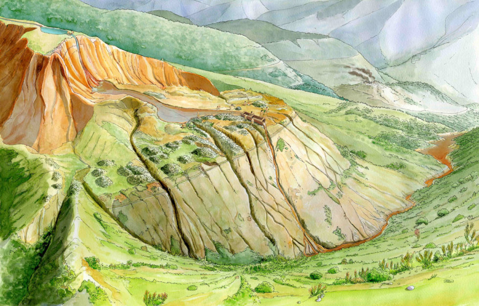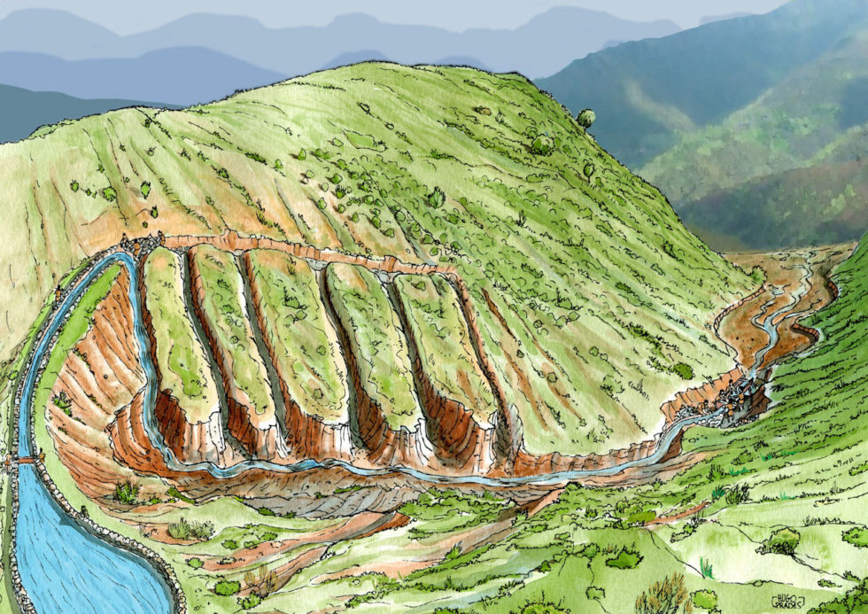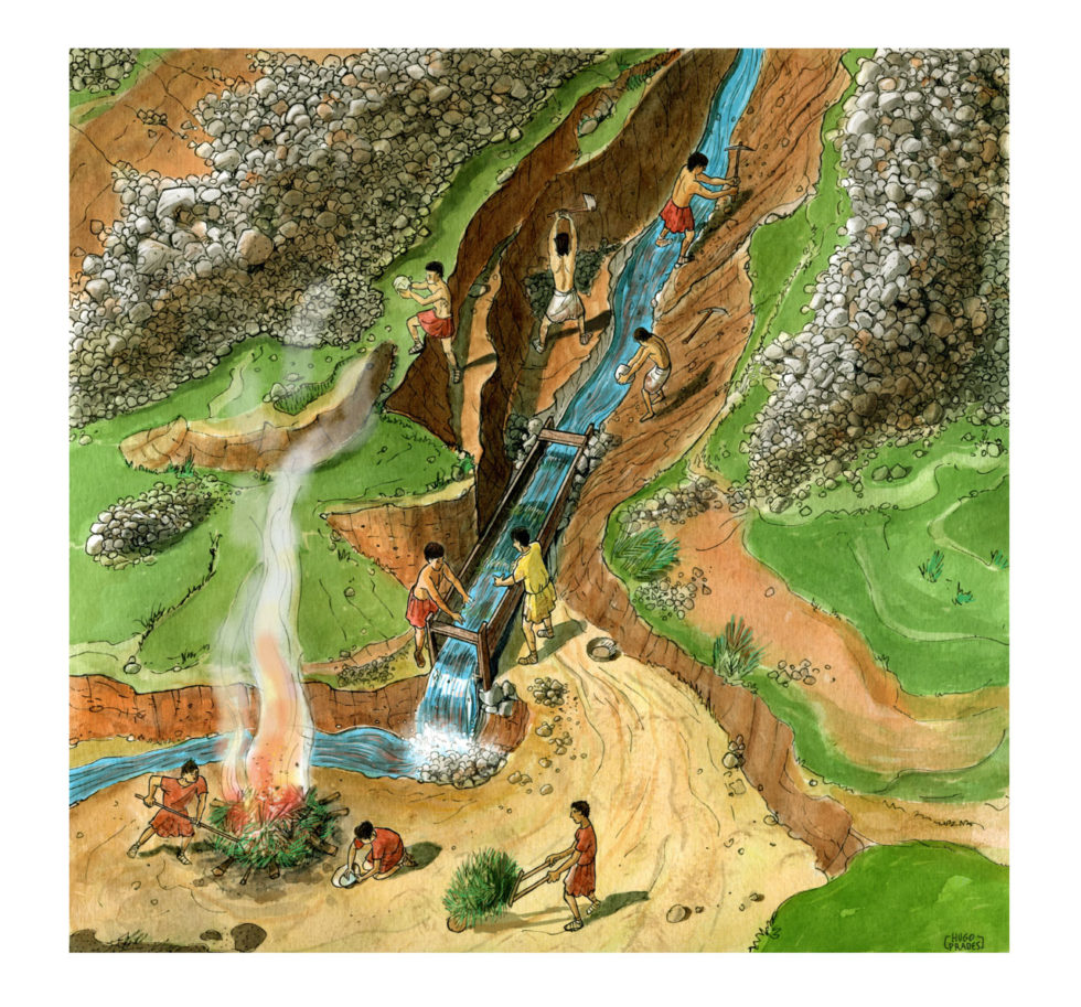 A partir del derrumbe de la montaña las operaciones se asemejan notablemente a las descritas anteriormente, se apartan las piedras y se hace discurrir con la ayuda del agua la tierra por los canales de madera en cuyo fondo se deposita el oro. La descripción de estas labores, algunas de ellas sin contrastar arqueológicamente por la pérdida entre otros de los materiales vegetales, nos la proporciona el escritor romano Plinio. En el llano queda todavía otro trabajo. Se excavan fosas por las que fluya la corriente -se llaman “agogas”-; éstas se cubren escalonadamente con “urce”. Es una rama similar al romero que por ser tupida retiene el oro. Los lados se cierran con tablas y por las zonas abruptas son suspendidos los canales. Así la tierra fluye y se desliza hacia el mar y el monte derrumbado se diluye, e Hispania ya ha arrojado tierras a lo lejos en el mar por estas causas. El “urce” se seca, se quema y la ceniza se lava sobre un lecho de césped, para que el oro se decante”.