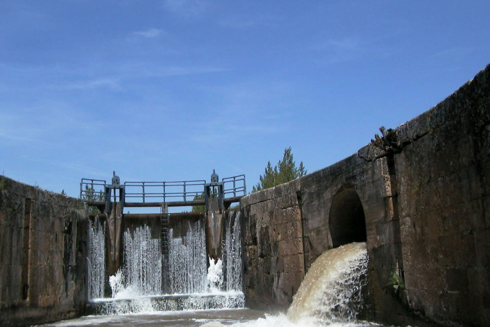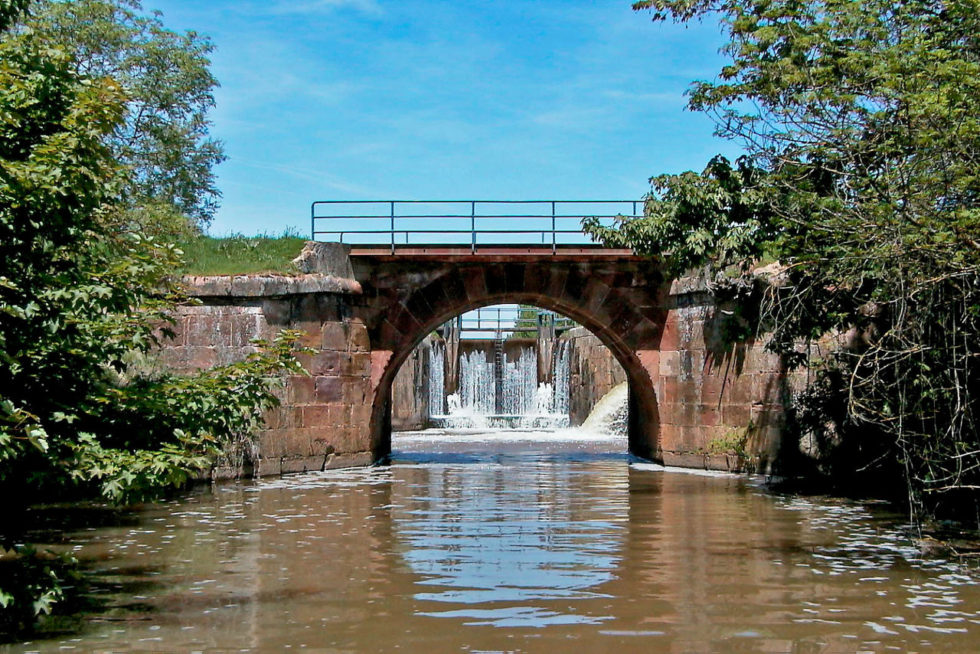 Desde el Centro de Interpretación también es posible iniciar una ruta a pie que discurre paralela al Canal. Hacia el sur nos encontraremos rápidamente con una magnífica construcción: la esclusa de retención ideada para impedir que se desbordara el canal durante las frecuentes crecidas del río Pisuerga.