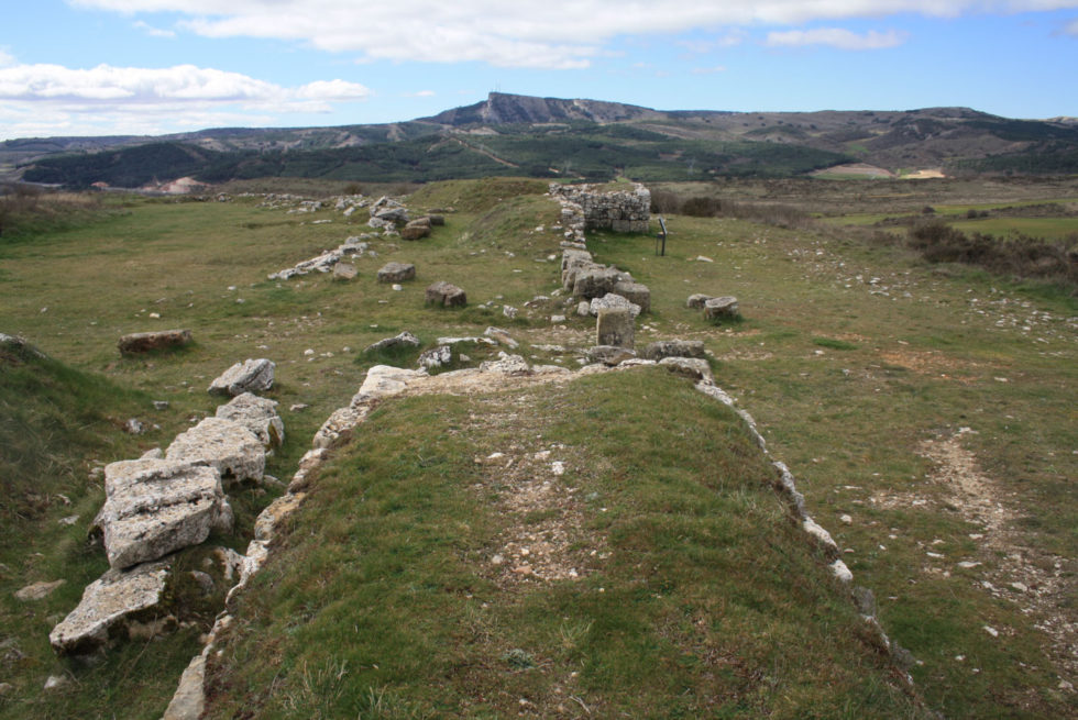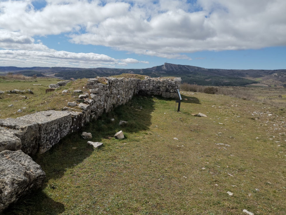 Antes, casi por fuerza, debemos haber atravesado la muralla tardorromana reconstruida en época visigoda. En su conjunto es una estructura muy ordenada, compuesta por un lienzo trazado casi en línea recta del que sobresalen en disposición regular torres cuadrangulares.