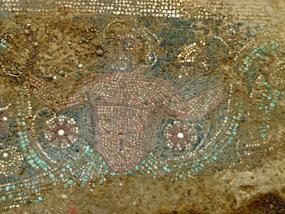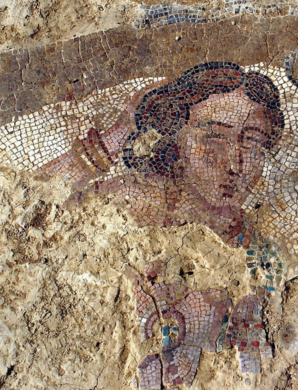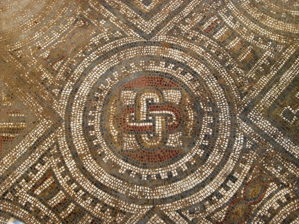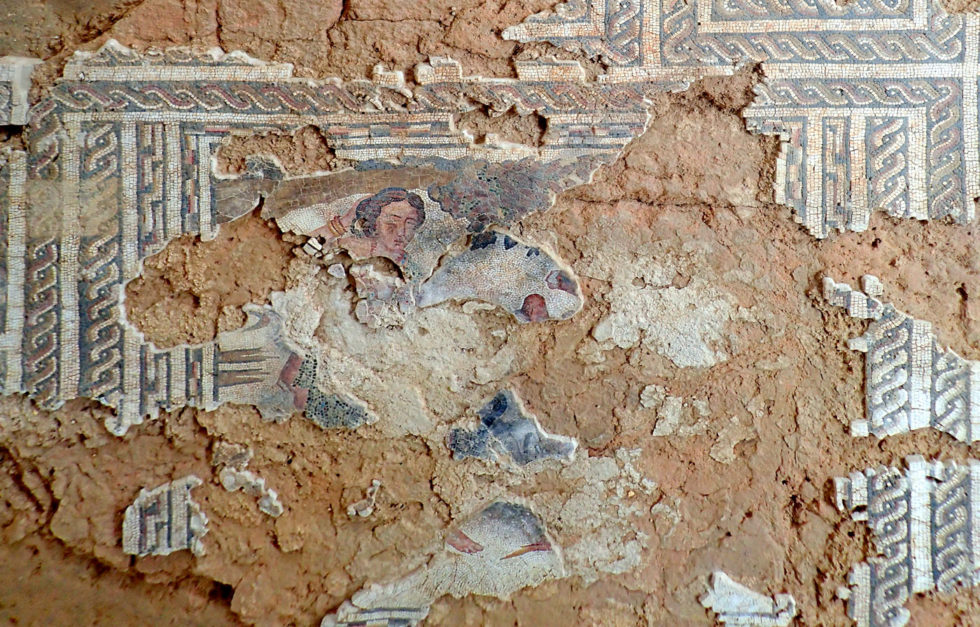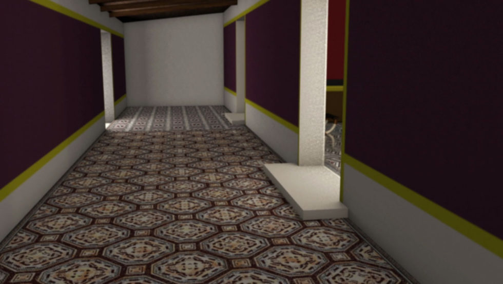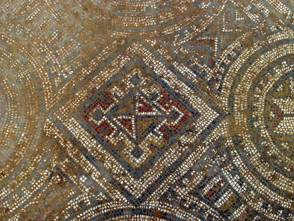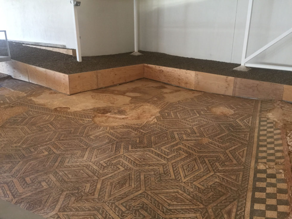 En torno al emblema se despliega un mosaico cuyo diseño responde a una compleja composición de tres cenefas, dos geométricas y una vegetal en la que se engarzan genios. Cadenetas de ochos formando esvásticas y rombos con motivos vegetales completan el resto del mosaico.