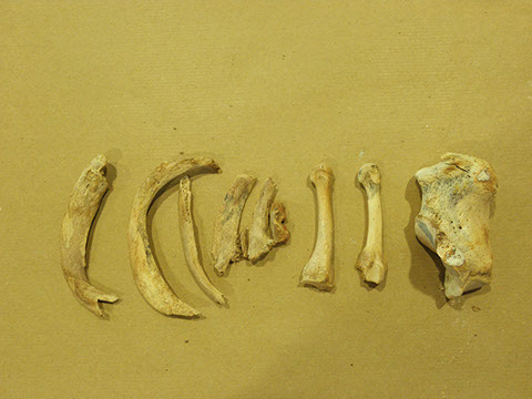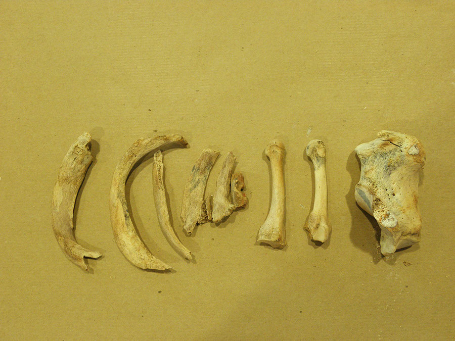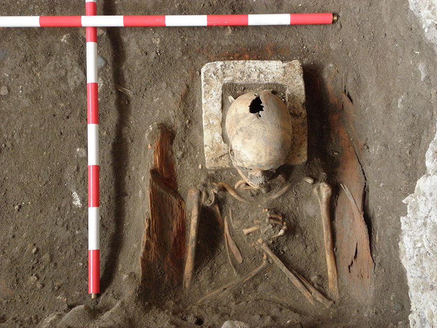 Sepultura del siglo XVIII localizada en la panda norte del claustro. El cráneo descansaba sobre una pequeña caja de piedra caliza que contenía en su interior unas reliquias (huesos humanos envueltos en un paño de lino). Este tipo de piezas se conocen como lipsanotecas.