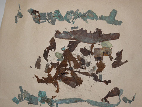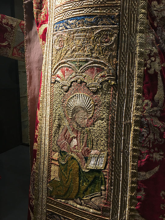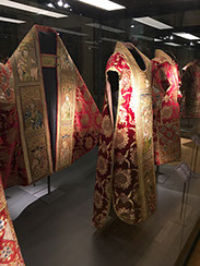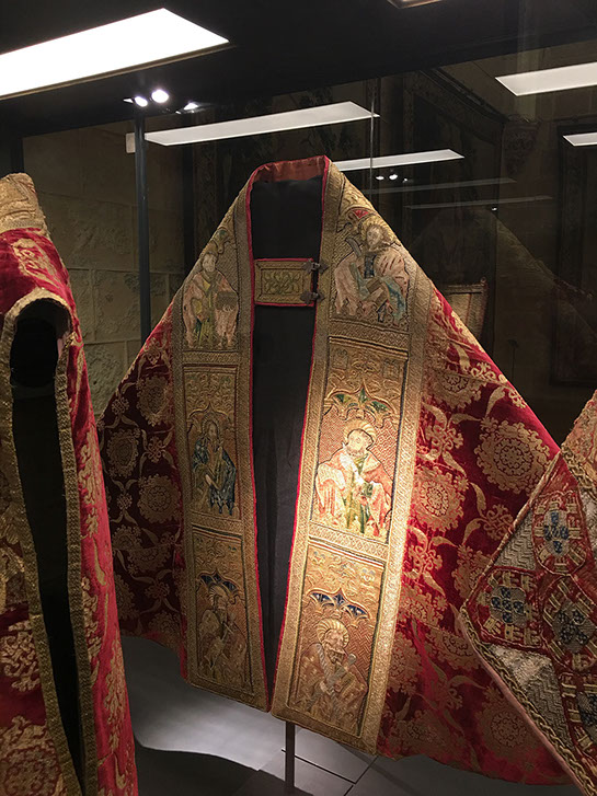 Restos de los ropajes localizados en las sepulturas del claustro. Se corresponden con las tiras bordadas que adornaban las casullas de los canónigos enterrados.