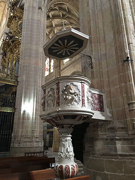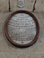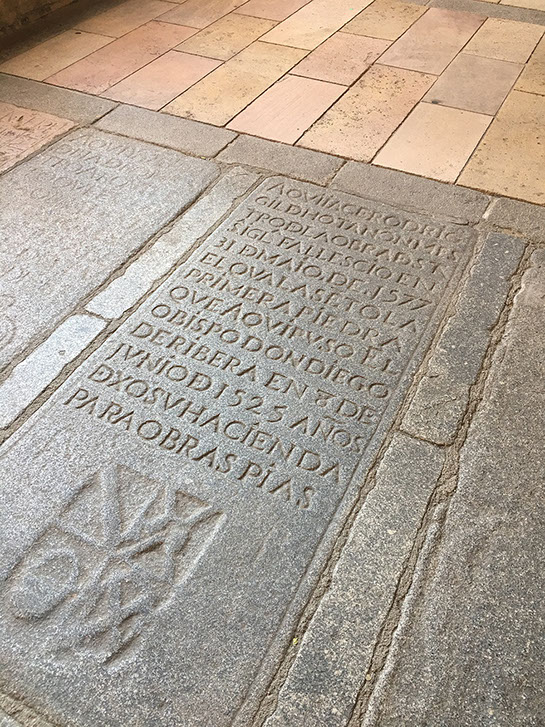 Lápida de la sepultura de Rodrigo Gil de Hontañón, maestro de la Catedral. Originariamente estaba ubicada en el interior de la iglesia, pero fue trasladada a mediados del siglo XVIII cuando se llevaron a cabo las obras de pavimentación de losas rojas, negras y blancas.
