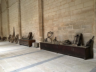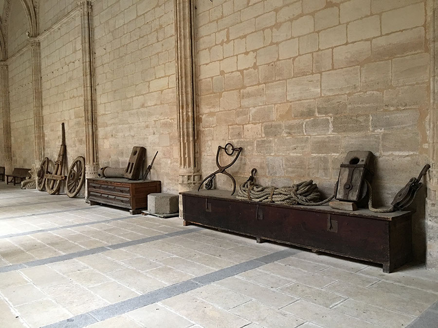 Vista general de la panda sur del claustro en donde se han ubicado las herramientas empleadas durante la construcción de la Catedral en el siglo XVI.