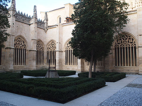 Vista general del jardín interior del claustro donde destacan los cuatro boj centenarios.
