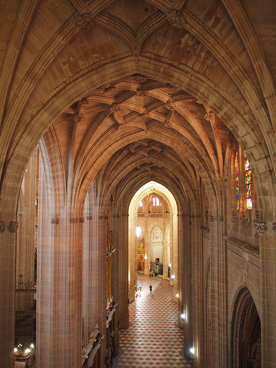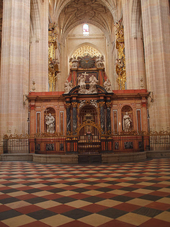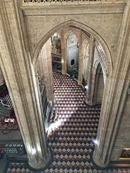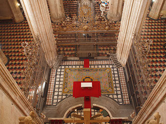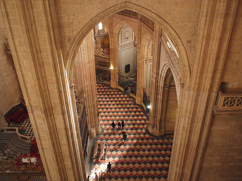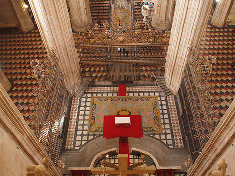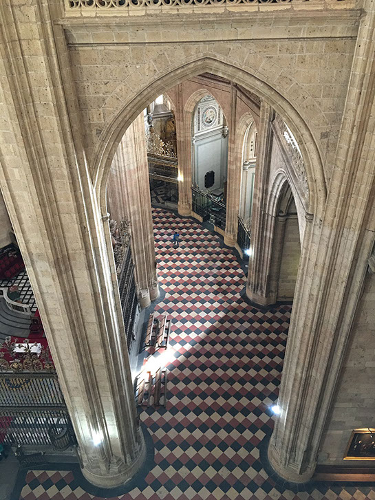 Detalle del pavimento de losas rojas, negras y blancas del interior de la Catedral visto desde la galería superior del crucero.
