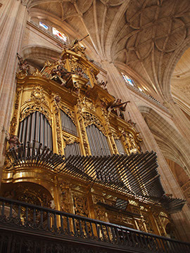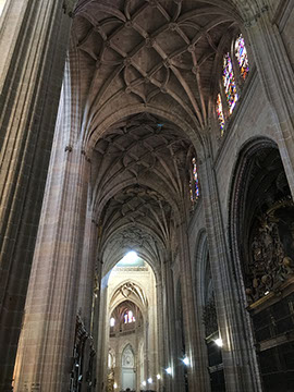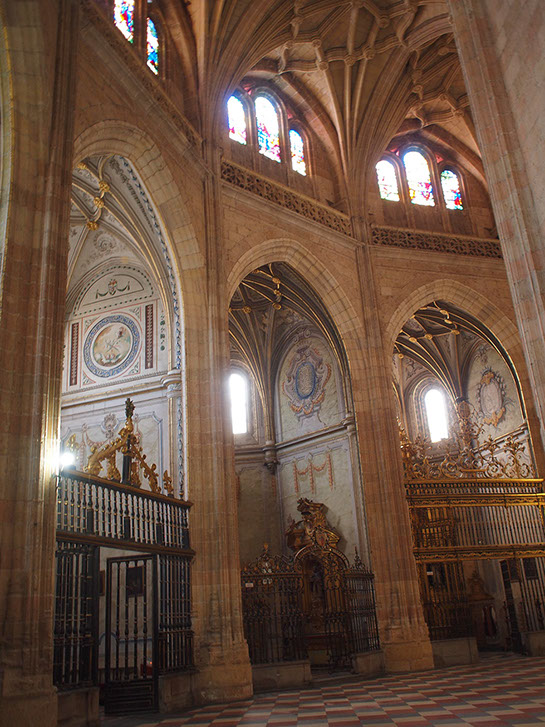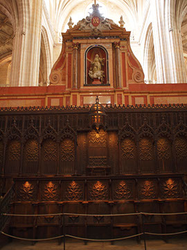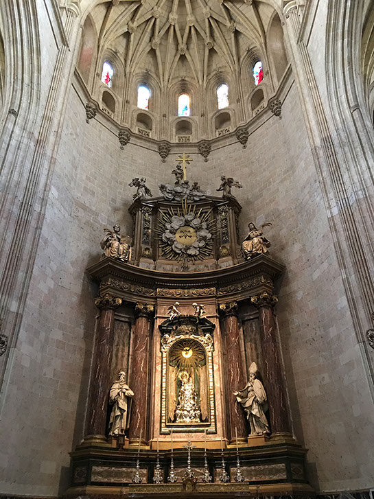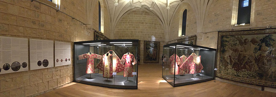 Vista panorámica de la antigua librería, lugar destinado a la exposición de los ropajes litúrgicos de los obispos Arias Dávila y Fadrique de Portugal. También se exponen los tapices del Sol y Marte correspondientes a la serie Los Planetas del siglo XVI.