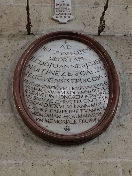 : Detalle de la placa conmemorativa del día de la consagración de la Catedral de Segovia, el 16 de julio de 1768.