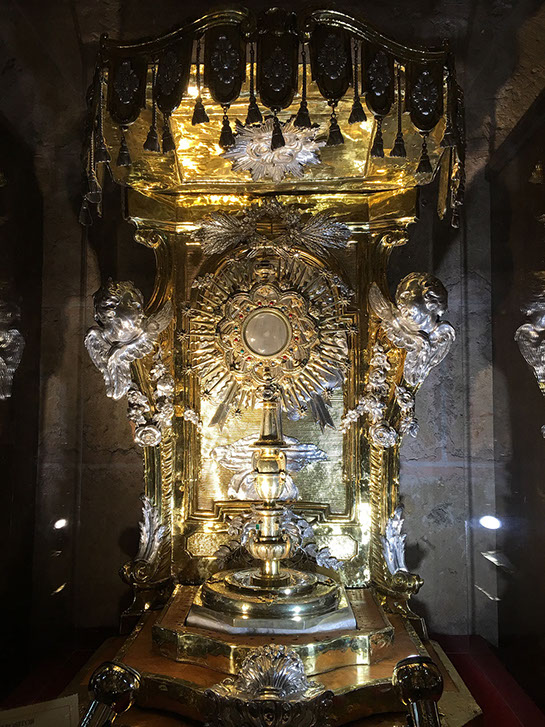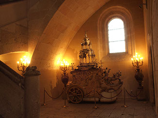 Carro triunfal de madera dorada y custodia de plata empleado en las celebraciones del Corpus Christi.