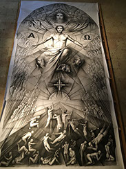 Cartón de la nueva vidriera creada por Muñoz de Pablos que muestra el Juicio Final y que será colocada en el vano central de los pies de la iglesia.
