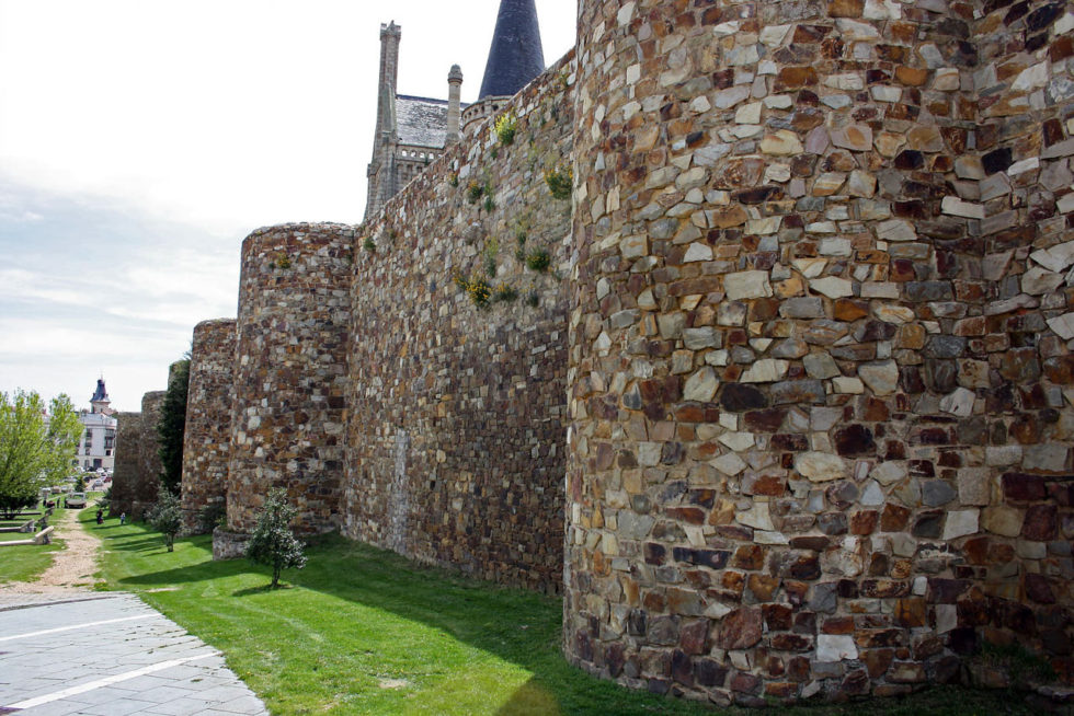 El recinto amurallado fue reedificado por el obispo Nuño hacia 1242 y sufrió diversas reparaciones durante la Edad Media que nos han legado su alzado e imagen actual y la noticia de sus puertas y postigos desaparecidos (puertas de Rey, del Sol, del Obispo, de Hierro). Su perímetro de forma trapezoidal sobre pasa los 2.100 metros y dispone de casi una treintena de cubos semicirculares con una media de siete metros de diámetro. Su soberbia imagen, unida al conjunto que forman la catedral y el palacio Episcopal, componen una de las estampas más conocidas de Astorga.