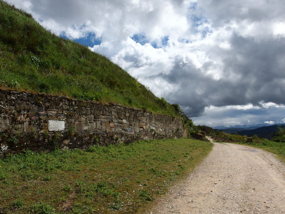 La muralla, descubierta en todo su perímetro exterior, conserva una longitud de 1.136 metros. Tiene 4 metros de ancho y 8 de alto y se refuerza con 15 torreones en su parte noroeste, la más accesible. Un camino atraviesa el recinto amurallado y en sus extremos se encuentran las puertas que daban paso a la ciudad romana. Flanqueadas por potentes bastiones se disponen al Este y Oeste y se las conoce como la Puerta de Sol y la Puerta del Viento. Su orientación estaría vinculadas a las dos calzadas romanas que conducían a la urbe. La Vía Augusta y Vía Nova que se encaminan respectivamente hacia el noroeste desde Asturica Augusta (Astorga) a Lucus Augusti (Lugo) y hacia el suroeste a Bracara Augusta (Braga).