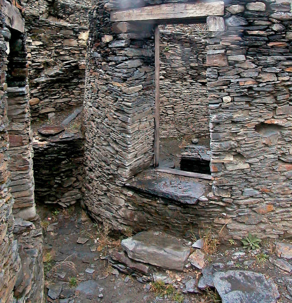 Las viviendas se distribuyen por la ladera sin un orden establecido, protegidas al norte por un gran muro de contención de cerca de 2 metros de anchura que las rodea. Es tal la densidad de viviendas que, salvando algunas escaleras de piedra, en muchos sectores no existe un espacio de circulación entre ellas, cortando incluso los pasos entre las casas con muros de nivelación. Las cabañas son de planta circular y oval, tienen entre 3,5 y 5,5 metros de diámetro y disponen de un umbral sobre elevado de las puertas para protegerse de las aguas de lluvia. Otras características comunes a todas ellas es la presencia de un pequeño murete en el centro con un orificio para introducir el poste central que sostenía la cubierta; una losa de pizarra apaisada delimitada por otras piezas de pizarra hincadas que servía de cocina; pequeños huecos en las paredes a modo de alacenas; y un banco de piedra pegado a los muros usado de asiento durante el día y de lecho para el descanso nocturno.