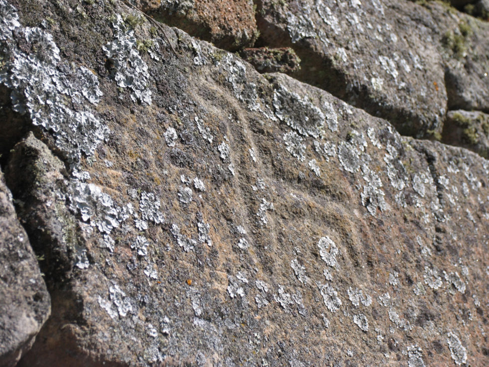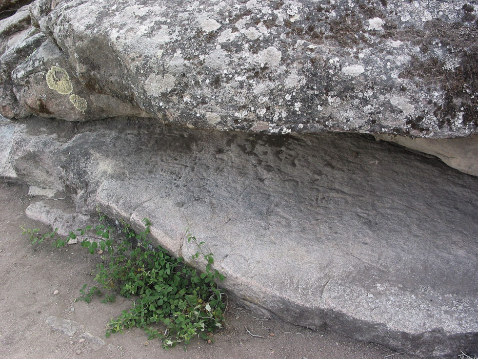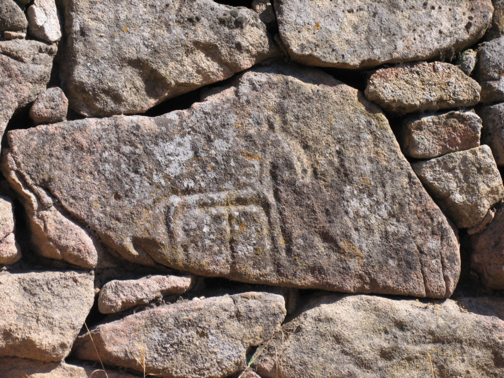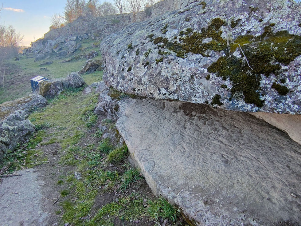 Continuando el itinerario alrededor del castro advertimos un estrecho portillo hacia la zona del arroyo del que se abastecerían de agua. Hay en esta zona numerosos grabados de animales, muy interesantes por su abundancia y calidad. Distinguimos numerosos caballos, aunque no faltan asnos, toros o jabalíes. Entre la multitud de grabados merece la pena contemplar, cerca del portillo, una interesante escena en la que se reconocen varios jinetes armados con lanzas que persiguen a unos jabalíes.