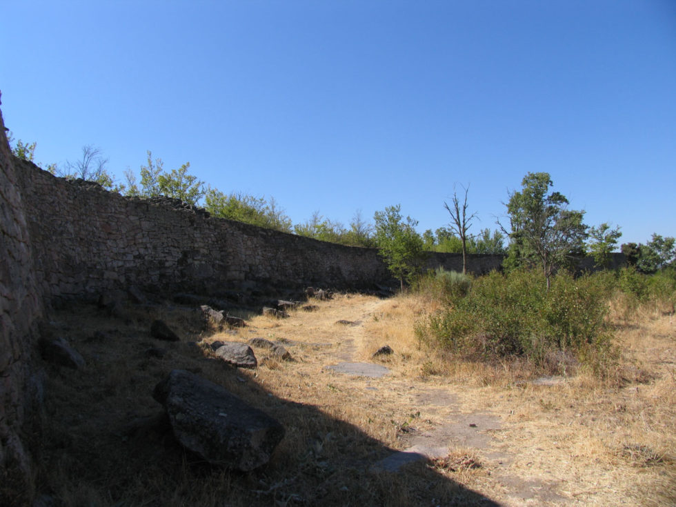 Avanzando por el exterior hacia el sur topamos con otra curiosidad de la construcción defensiva. La muralla en algunos puntos se levanta con doble paramento de sillares al exterior. El sistema constructivo de doble muro tiene la finalidad de impedir su ruina total en caso de ataque. De este modo, aún cediendo el primer muro todavía restaría por derrumbar el segundo.