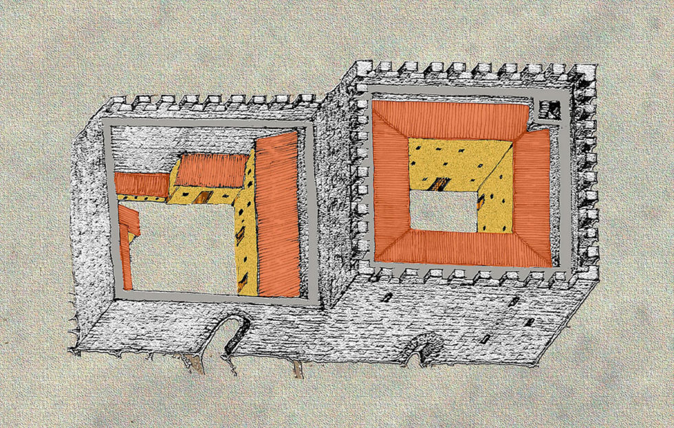 En el interior hay silos excavados en el suelo y al este se aprecia un recinto contiguo al castillo en el que se distinguen diversos espacios destinados al almacenamiento de víveres, zona de caballerizas, un palomar y una bodega.