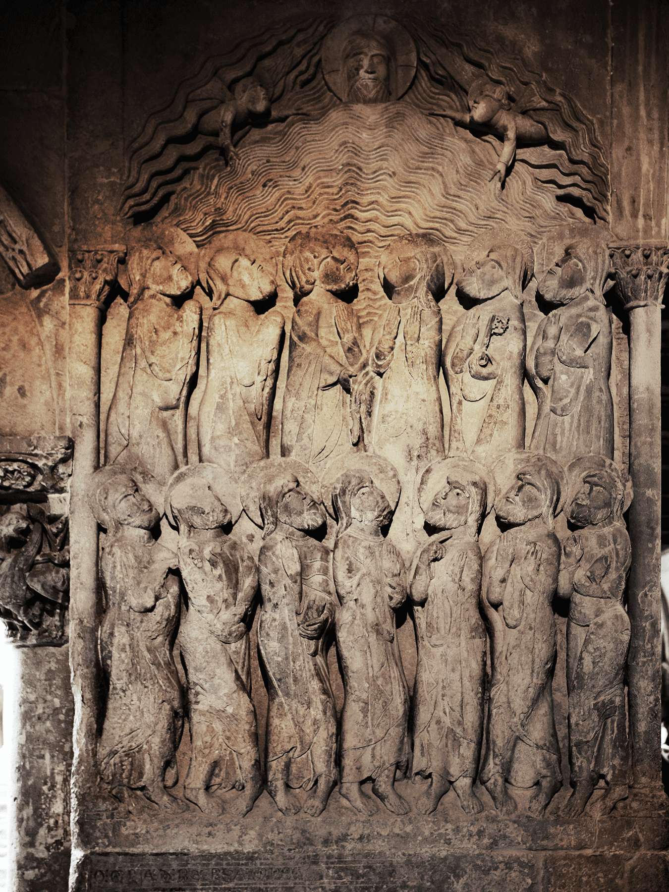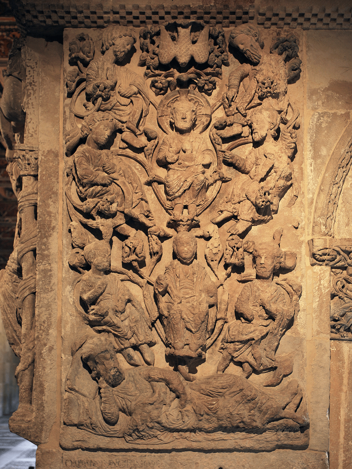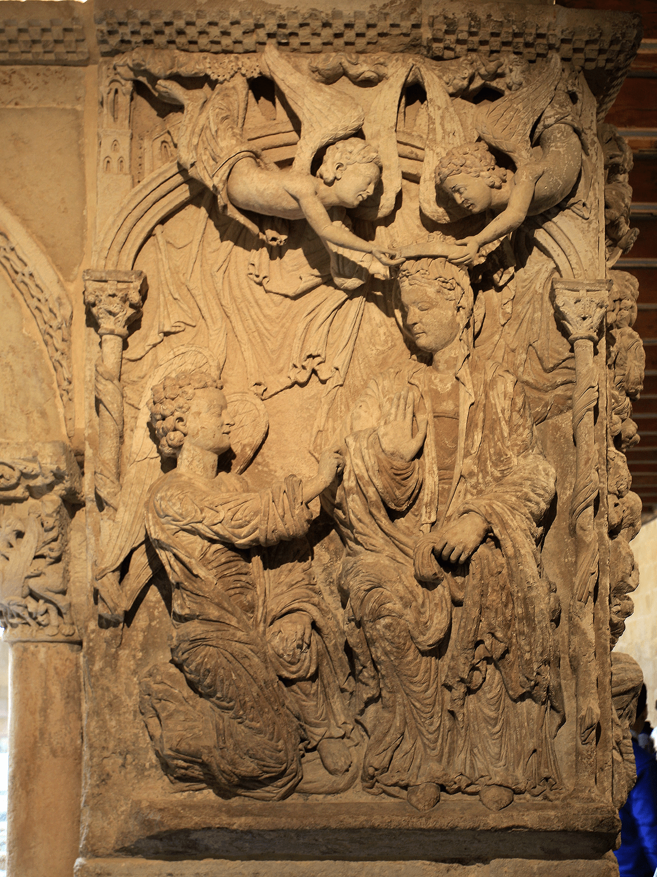 La parte occidental del machón entronca, por un lado, con el fervor a María que asoma con fuerza durante el siglo XII; y, por otro, se entrama con el dogma trinitario y la naturaleza de Cristo, figurados al otro lado del pilar. En relación con el Padre, emerge el misterio nupcial por el que Dios se convierte en su esposo. El relieve recuerda los orígenes de su concepción con la presencia del arcángel Gabriel. El Espíritu Santo actúa de mediador en su fecundación milagrosa. Y, por último, Cristo, Hijo de Dios, manifiesta su filiación terrena surgiendo del seno de la Virgen. Es su amado Hijo.