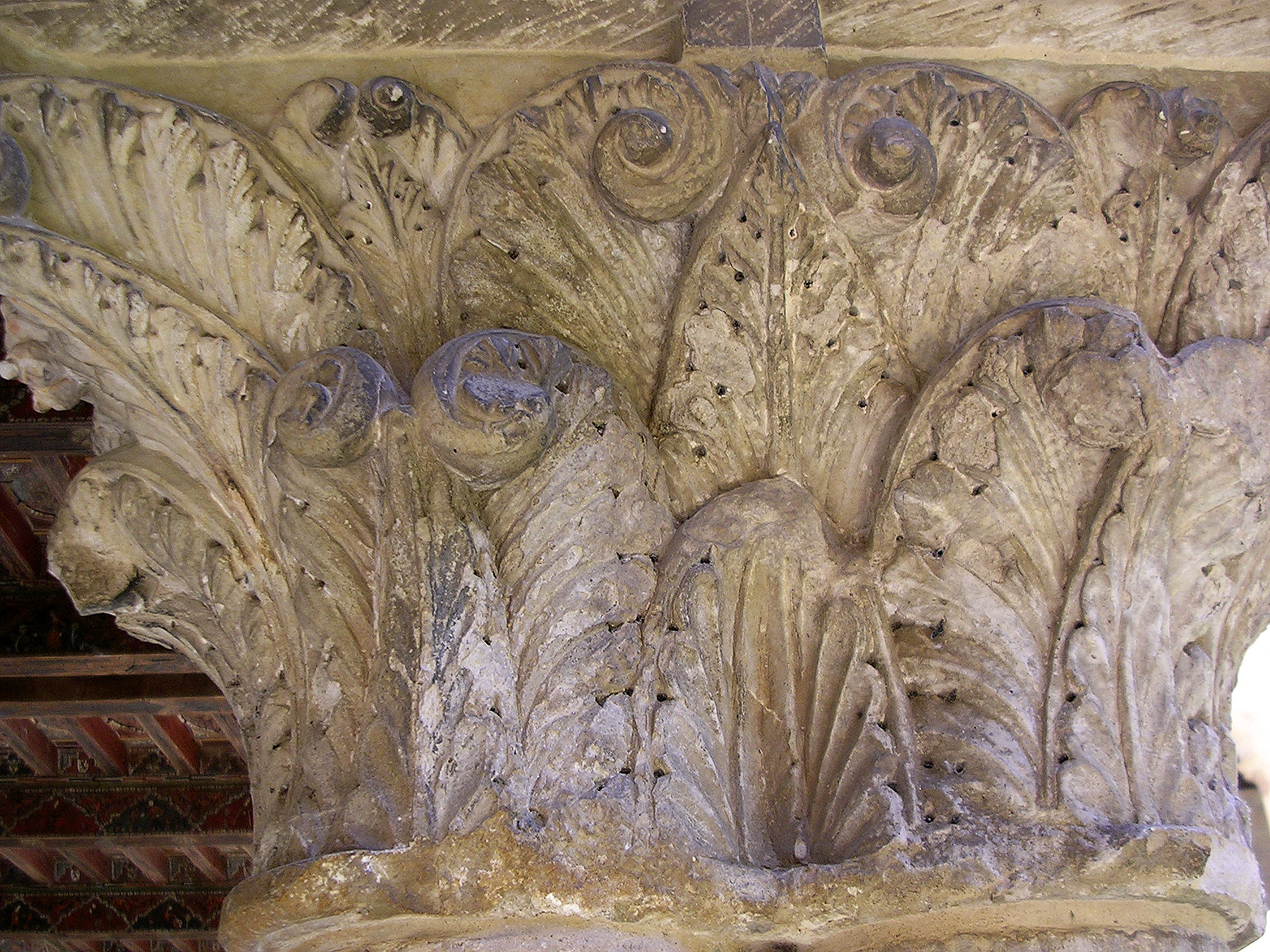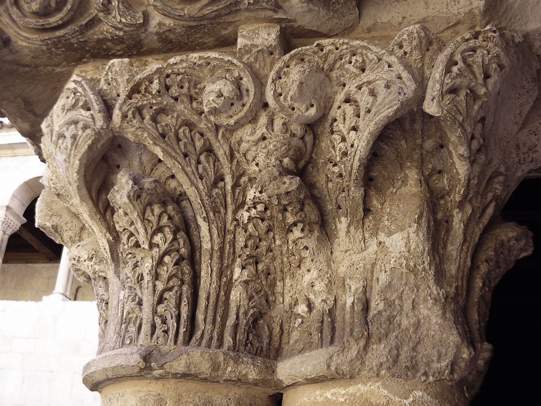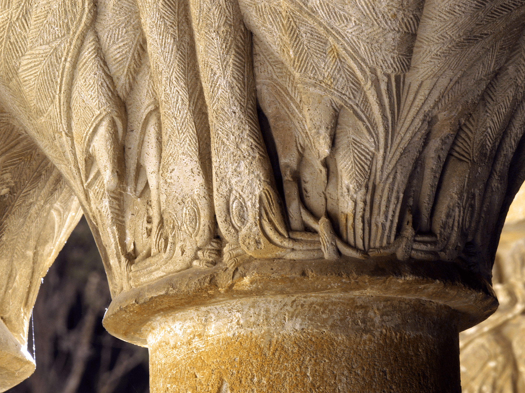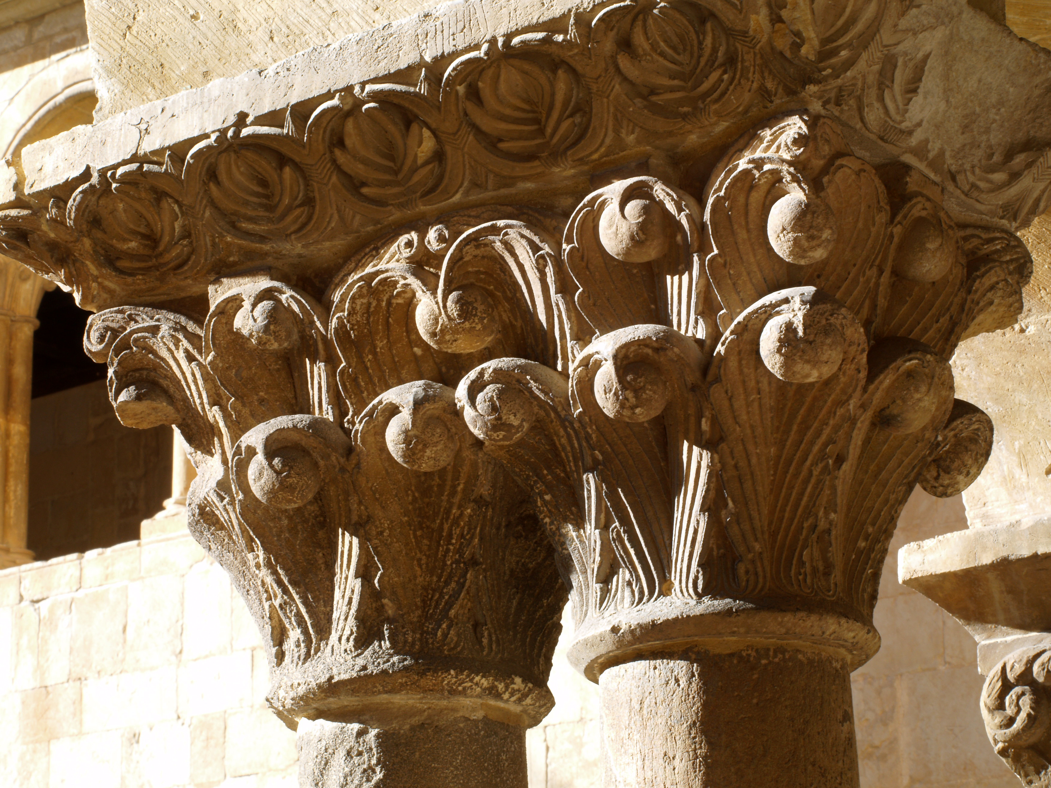 En el ala septentrional del claustro comienzan a surgir, con cierta reiteración, composiciones inspiradas en los antiguos capiteles corintios, formadas por hojas de acanto.