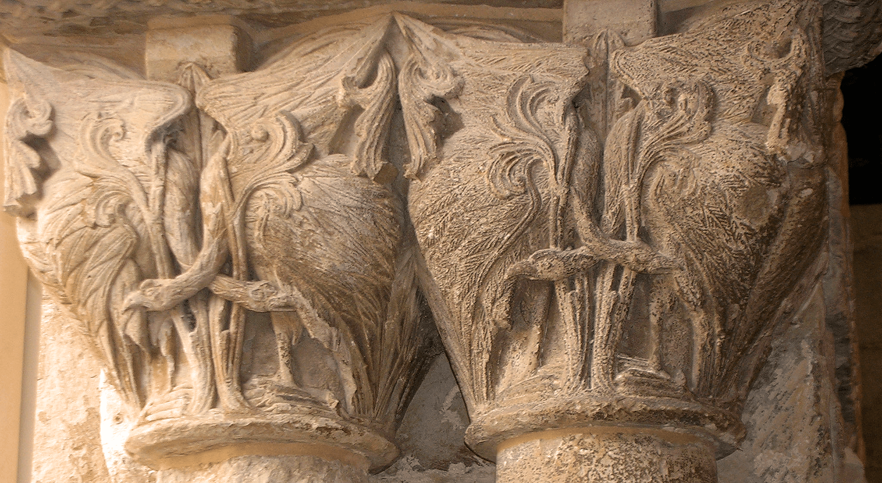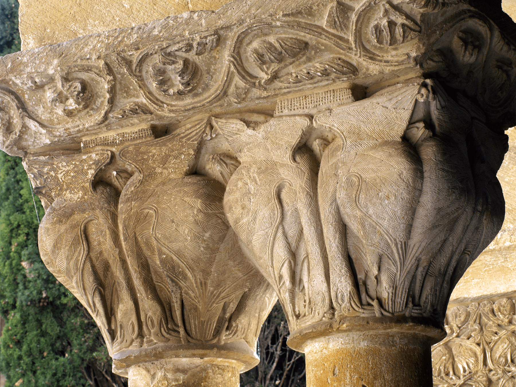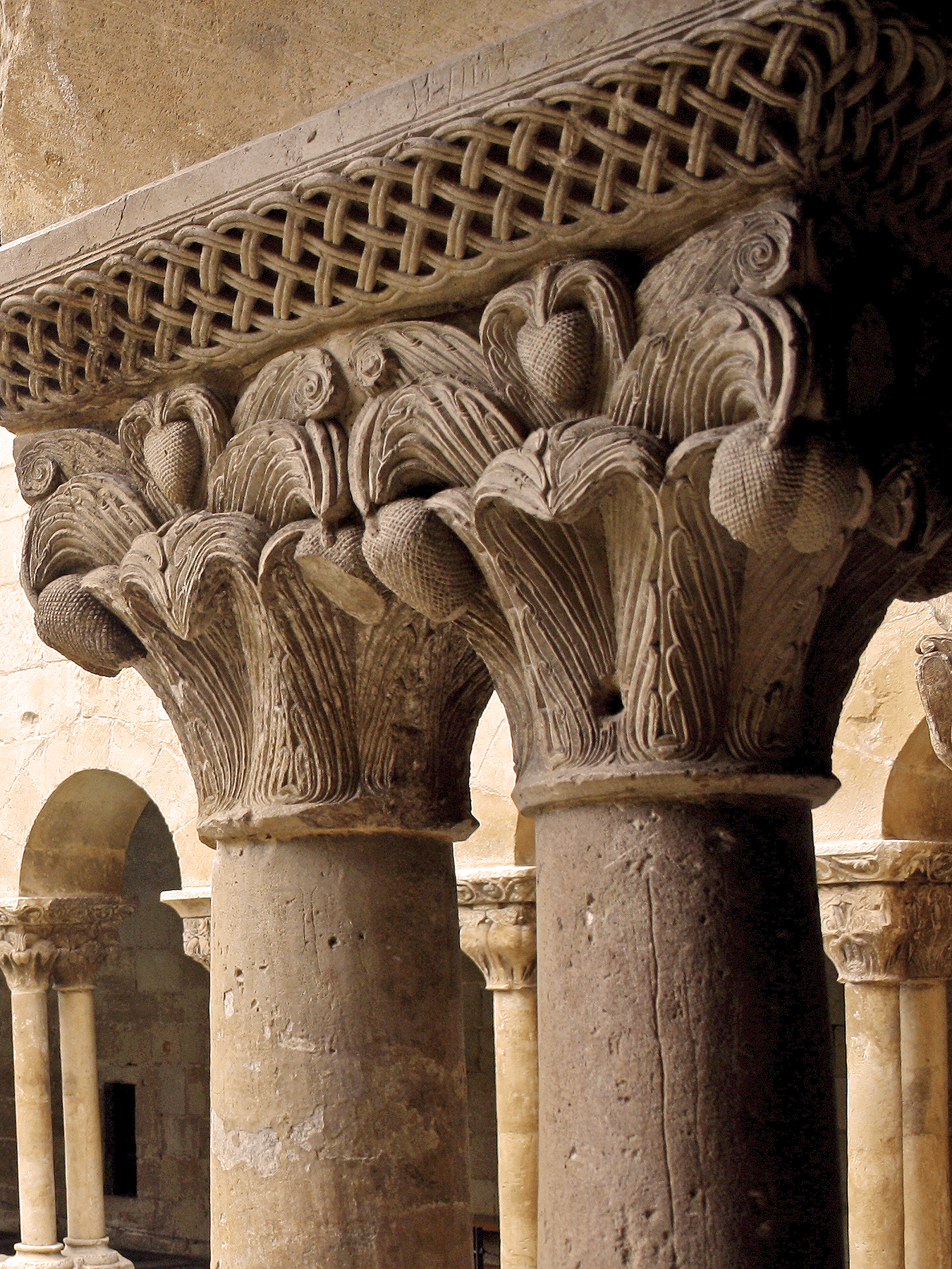 En el ala septentrional del claustro comienzan a surgir, con cierta reiteración, composiciones inspiradas en los antiguos capiteles corintios, formadas por hojas de acanto.