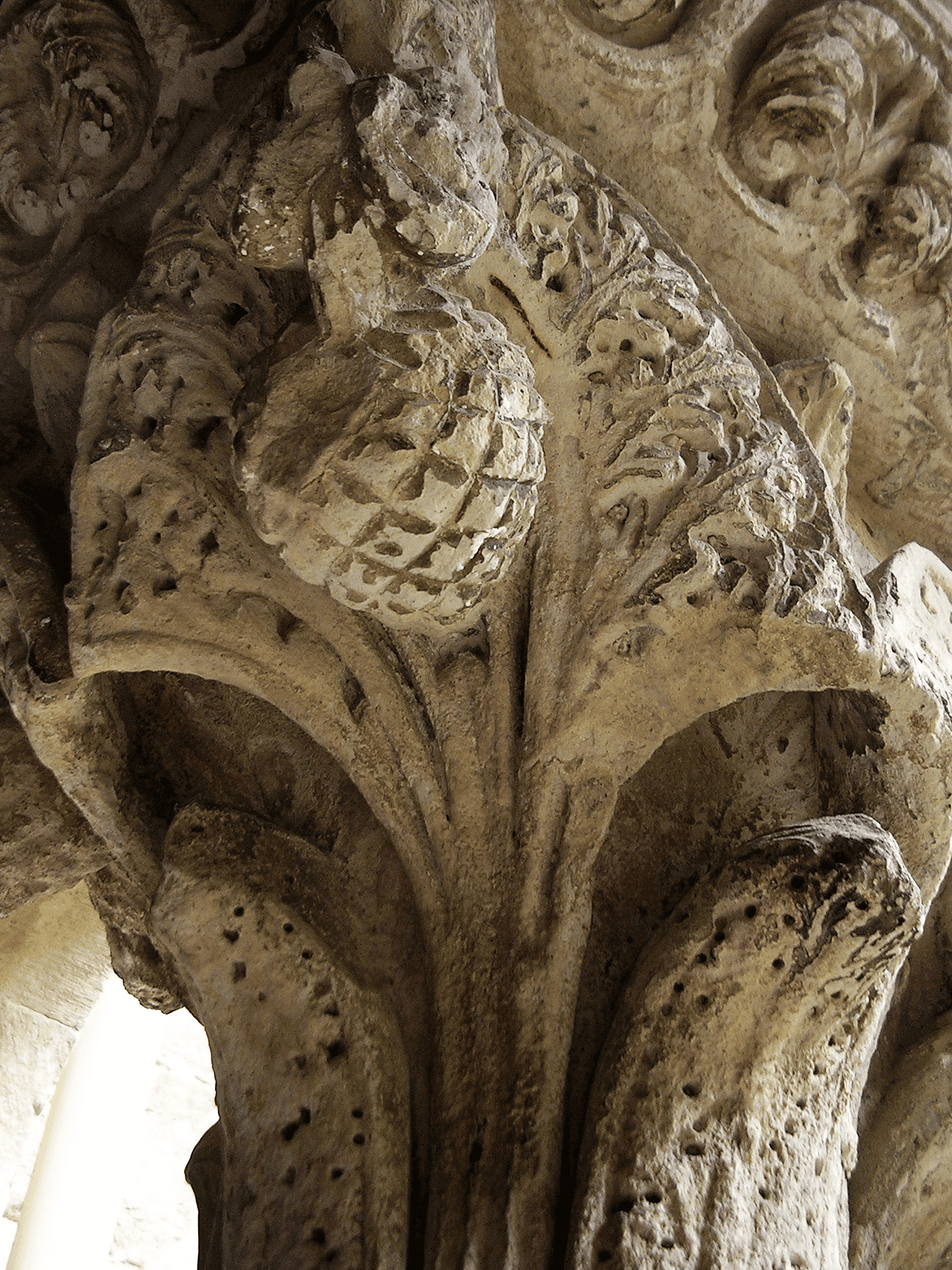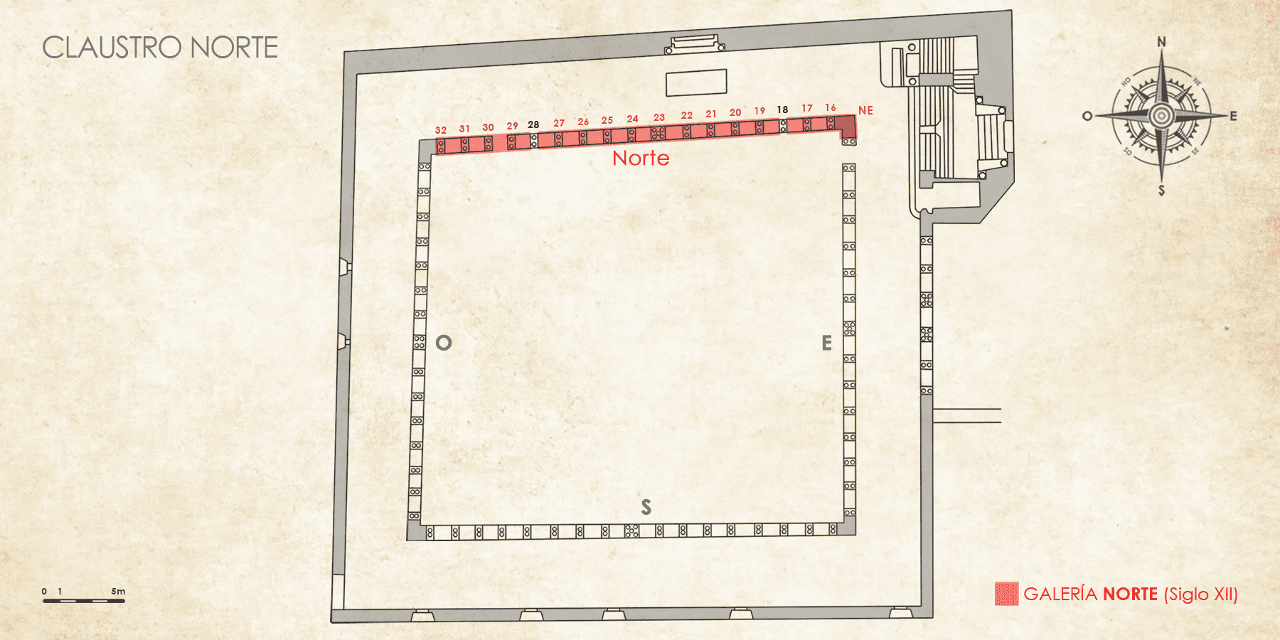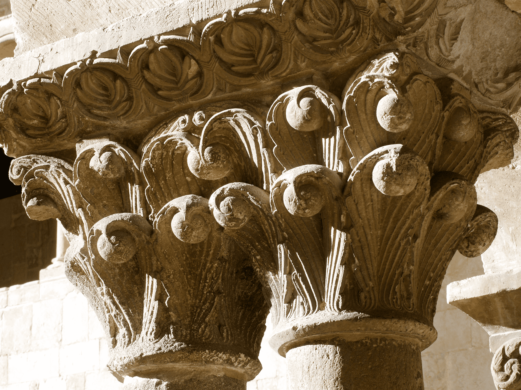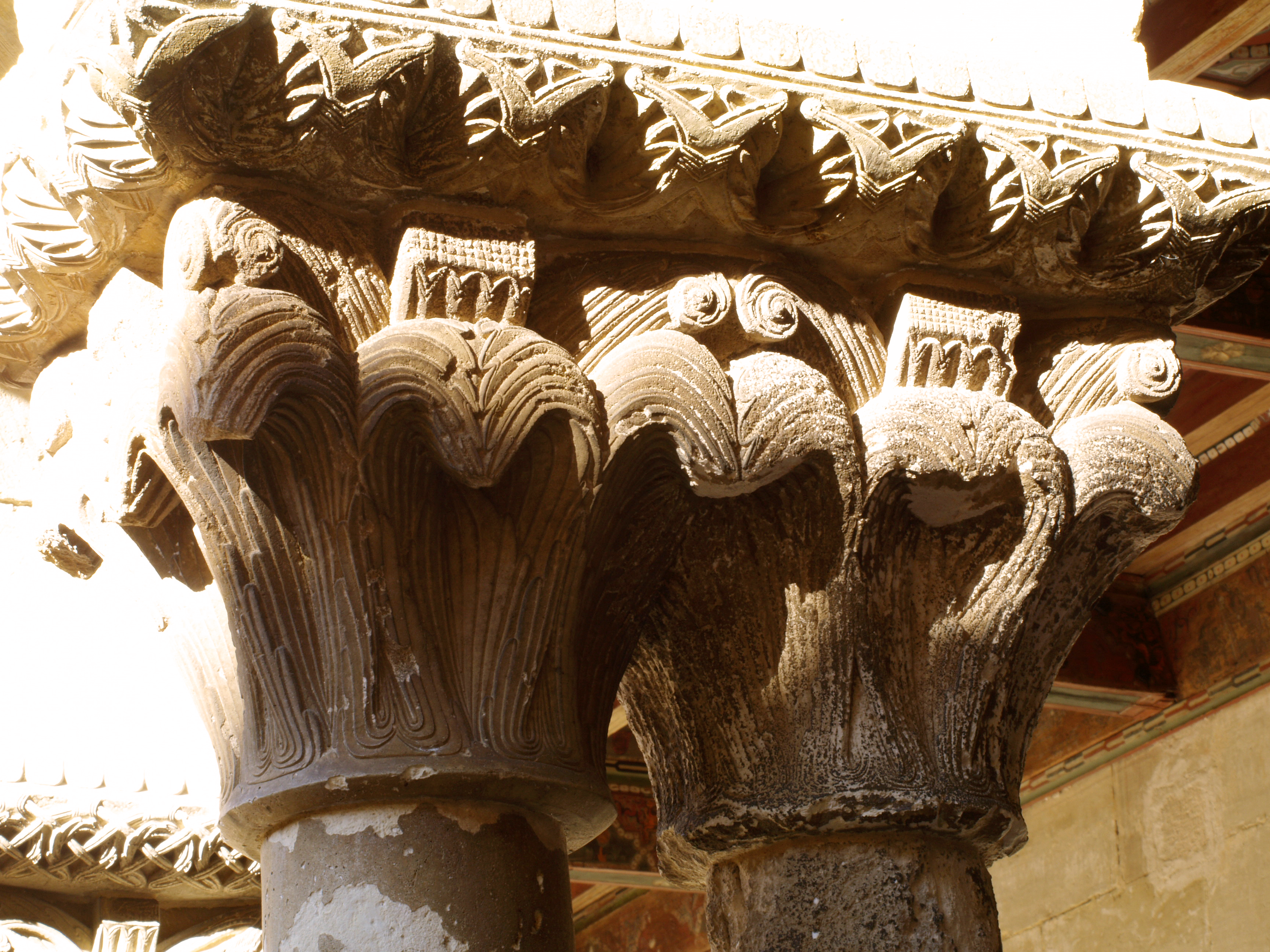 En el ala septentrional del claustro comienzan a surgir, con cierta reiteración, composiciones inspiradas en los antiguos capiteles corintios, formadas por hojas de acanto.