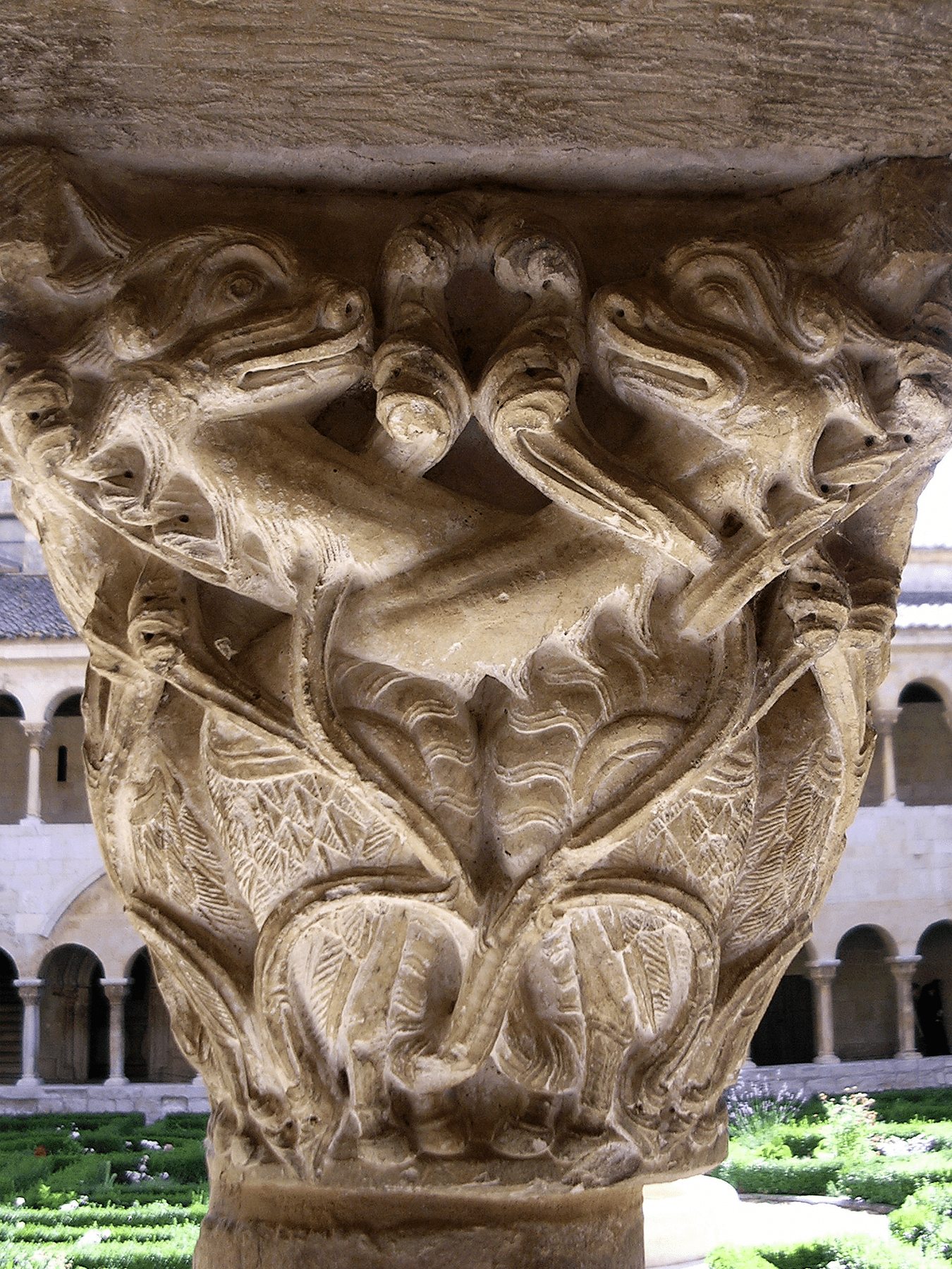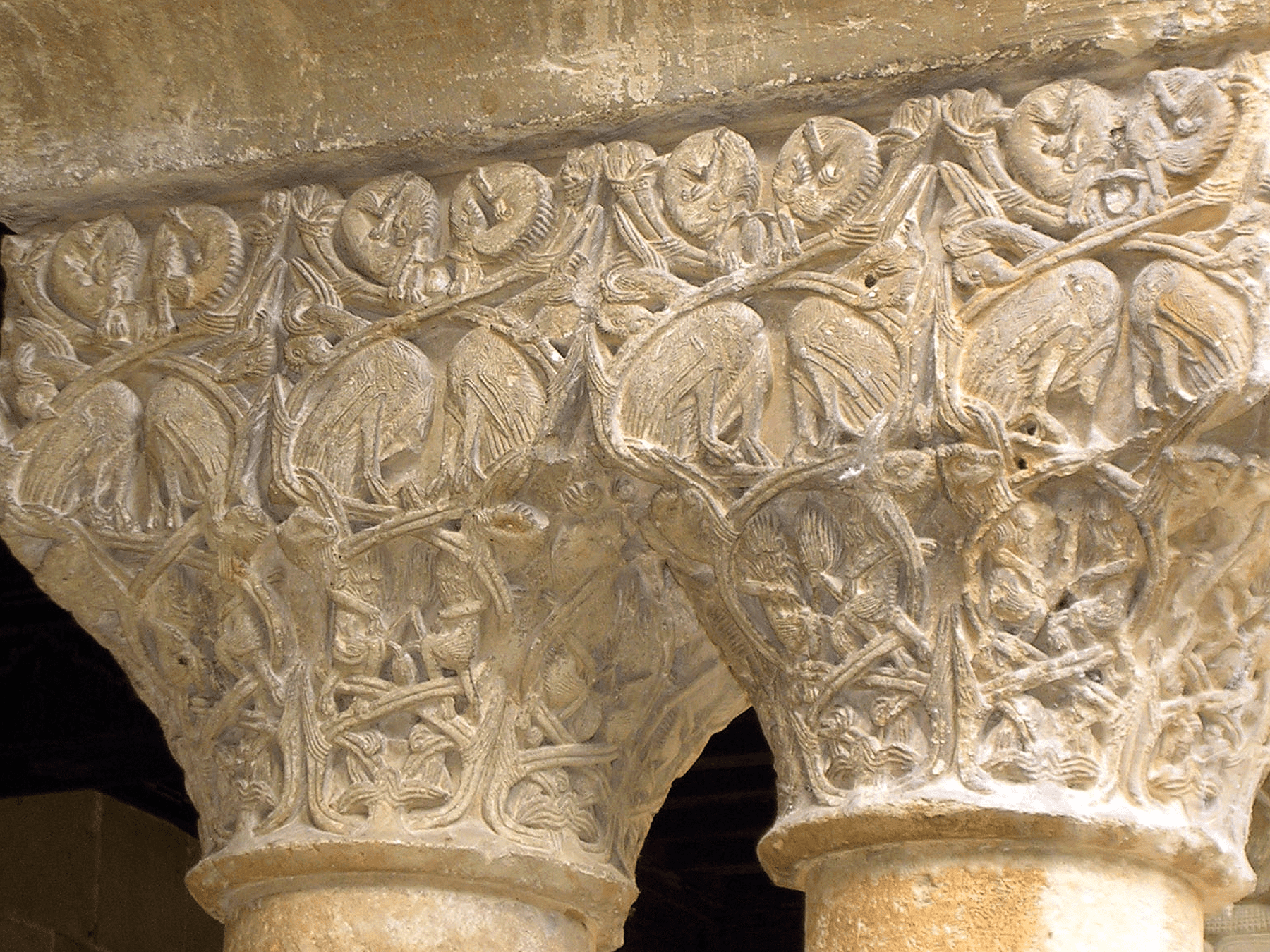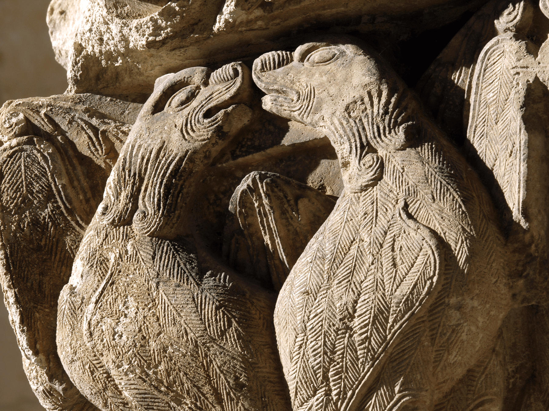 Este capitel de sirenas-pájaro prosigue el bestiario que, entremezclado con temas vegetales, concluirá el ornamento de las arquerías del claustro.