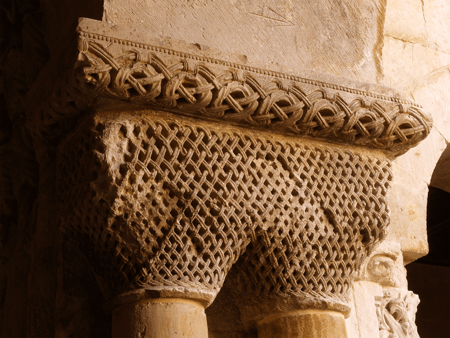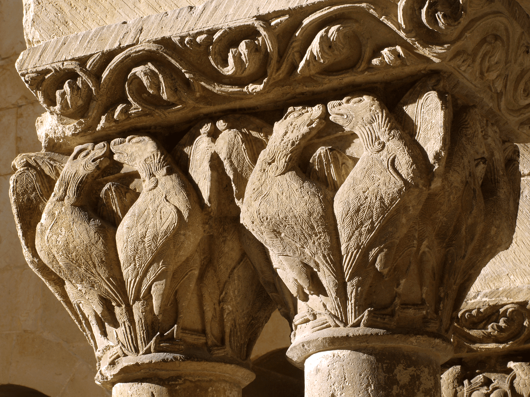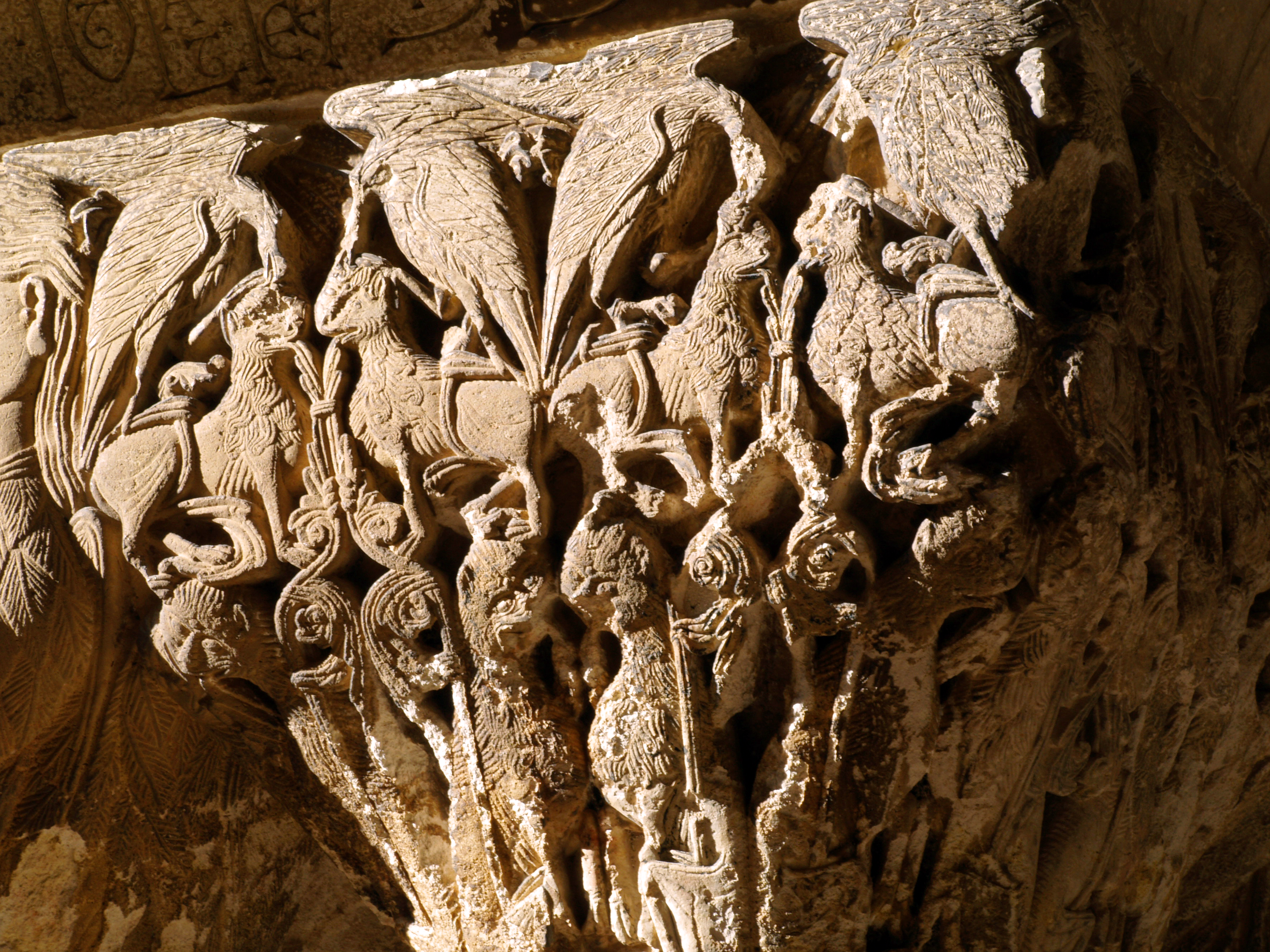 Este capitel de sirenas-pájaro prosigue el bestiario que, entremezclado con temas vegetales, concluirá el ornamento de las arquerías del claustro.