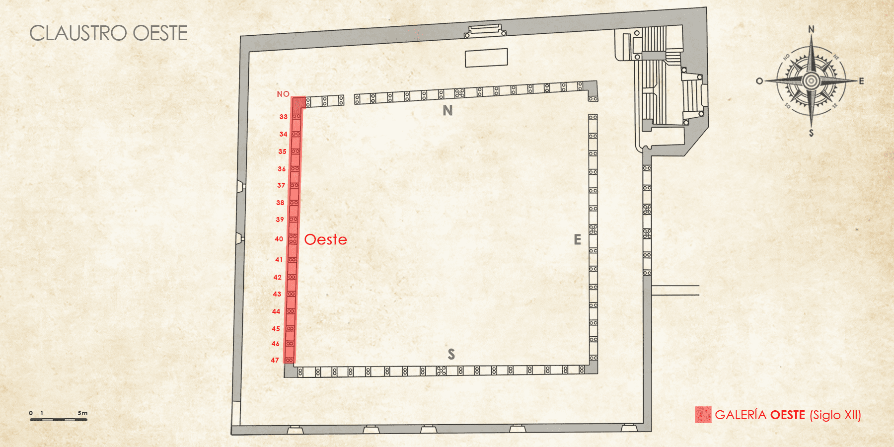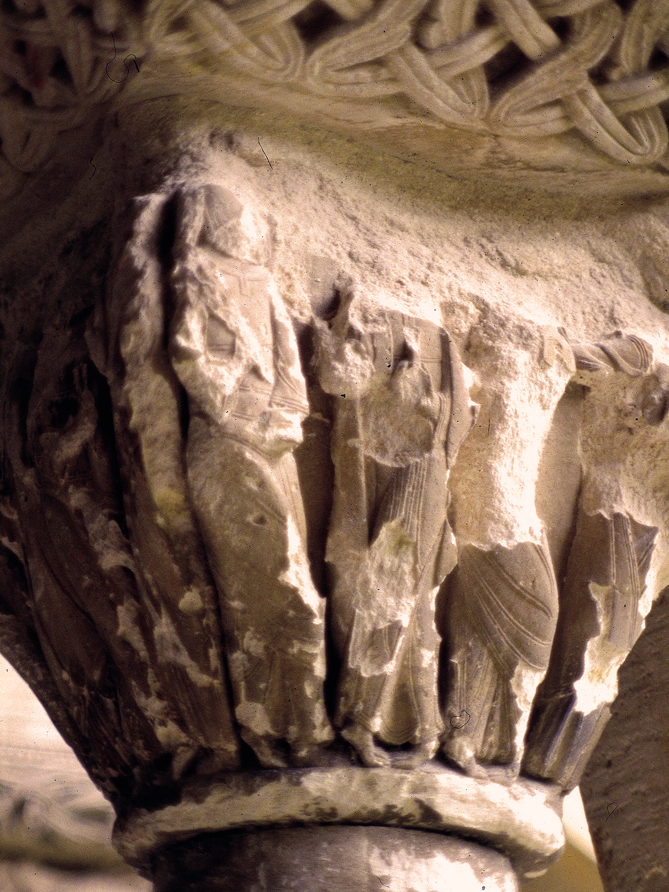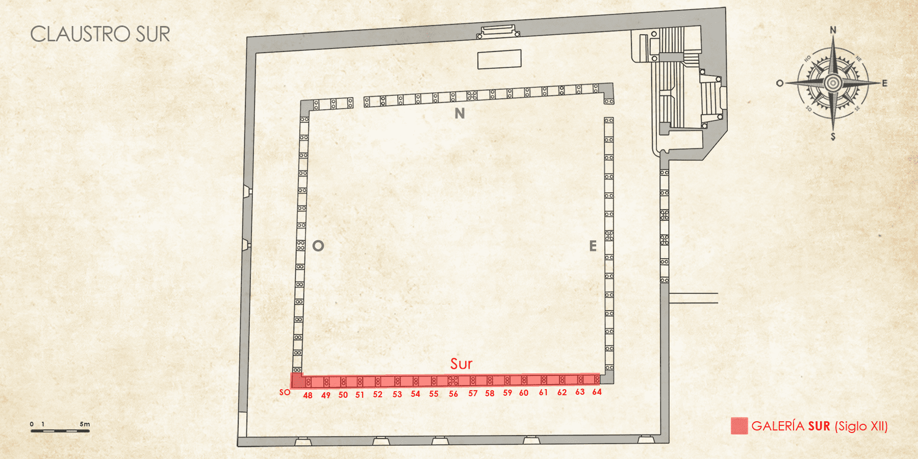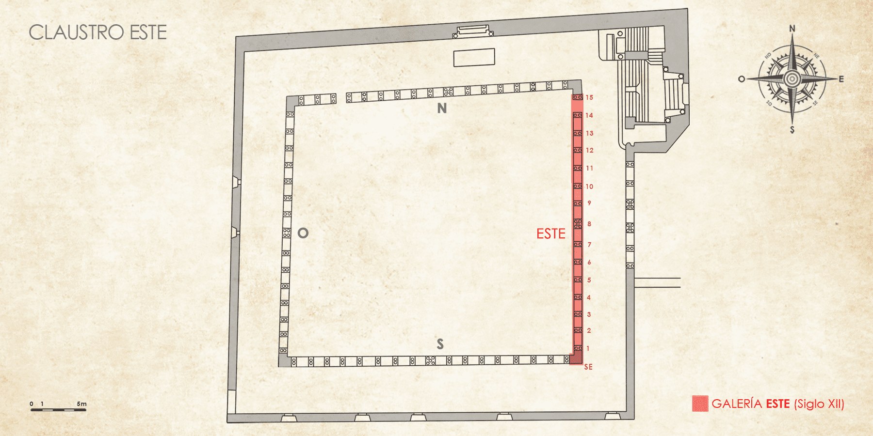 Se inicia la explicación de machones y capiteles por la panda del Capítulo, orientada al Este. Era la primera que se construía para facilitar el acceso de los monjes a la Sala Capitular. Tanto en esta galería oriental, como en la septentrional y parte de la occidental, machones y capiteles fueron esculpidos a fines del S.XI-principios del S.XII, y corresponden a la etapa más antigua del claustro.