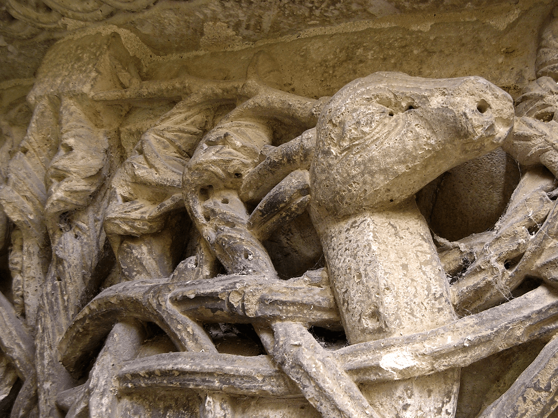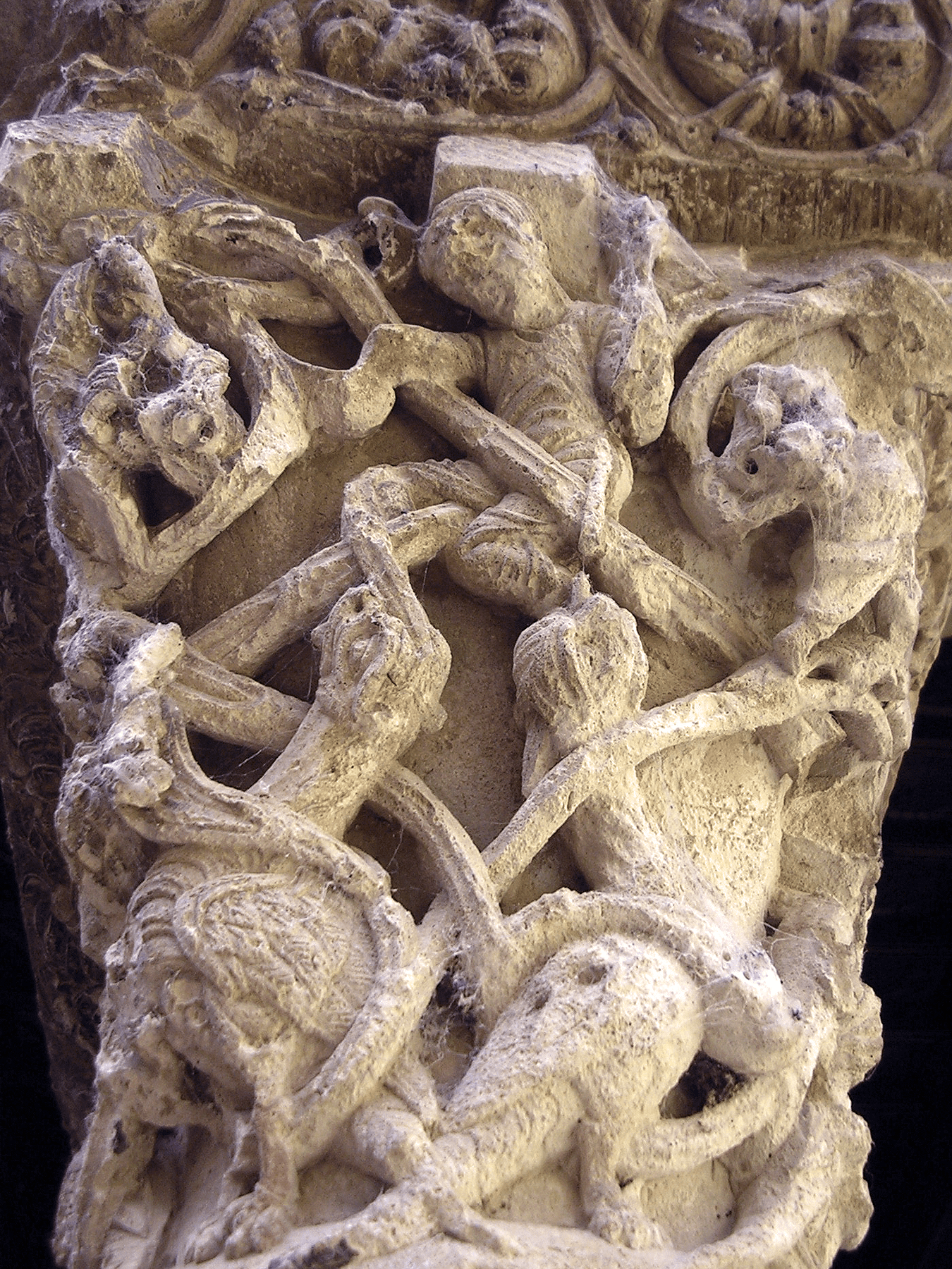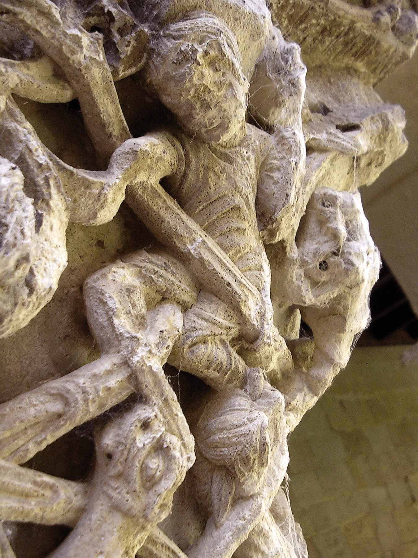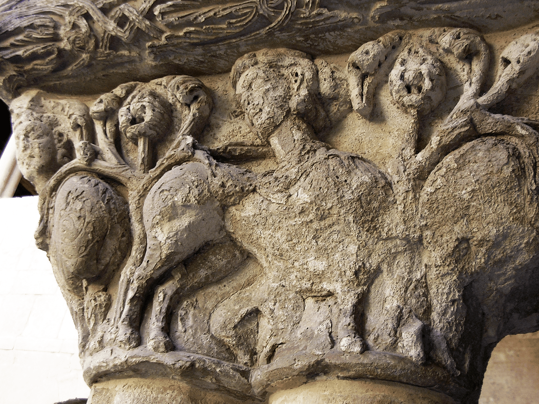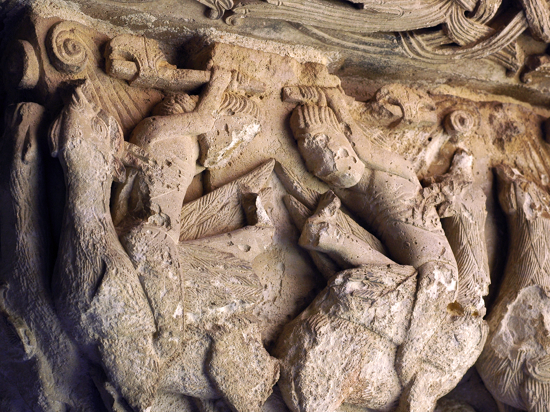 Aquí en el capitel, los onocentauros oponen sus cuerpos, pero giran los torsos para entablar batalla. Parecen armados; y los cabellos erizados, aún perceptibles, corroboran su furor. Según los teólogos, en sus relatos de los castigos del infierno, «cadenas amarrarán todos sus miembros”, porque los réprobos han “consagrado” su vida a los vicios. Del mismo modo, en el capitel, un enrame de tallos y hojas, presuntas «cadenas», oprimen a los onocentauros.