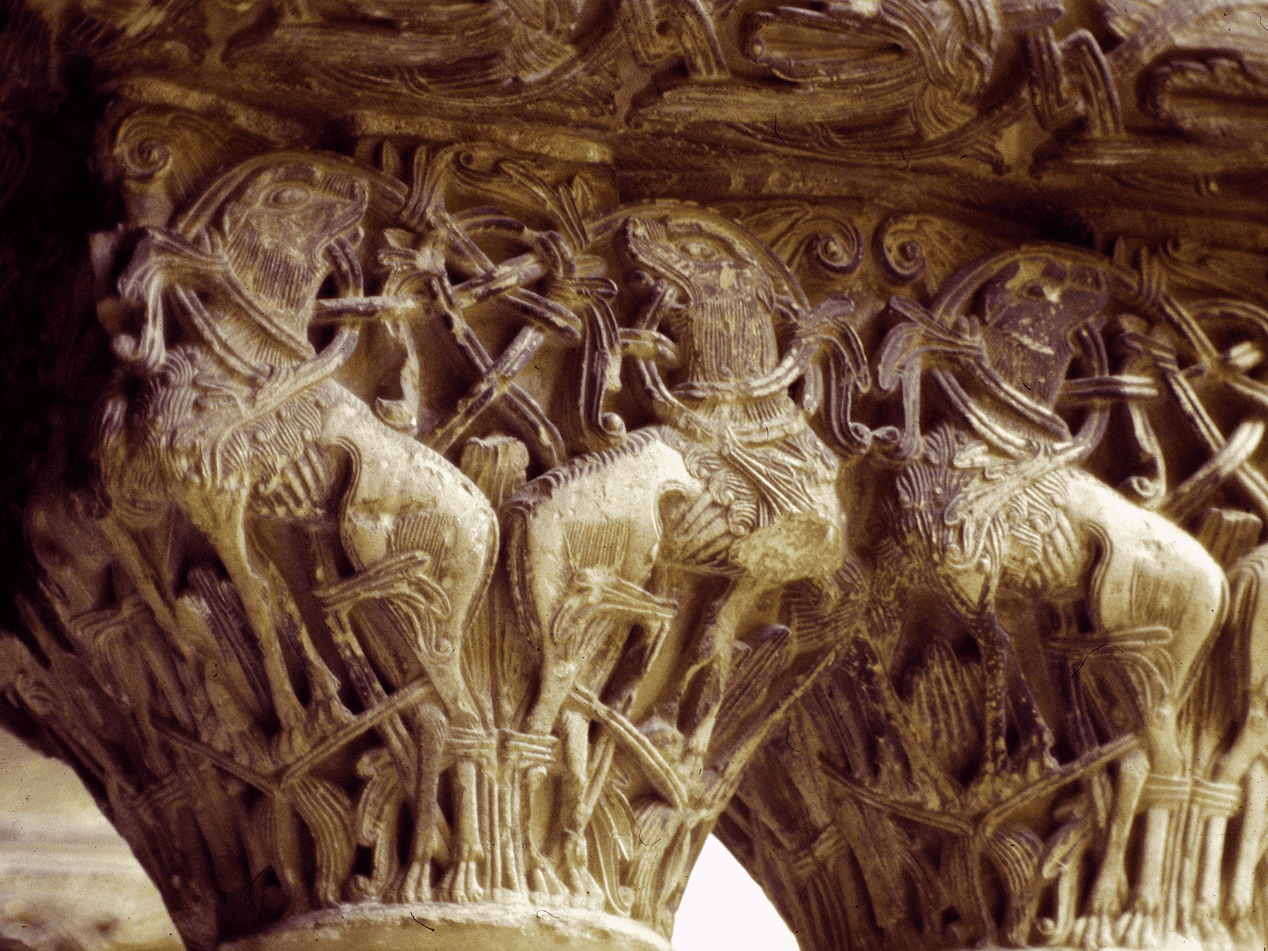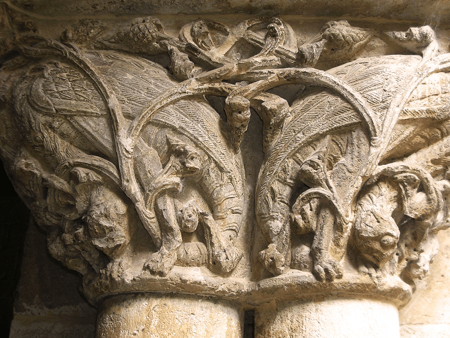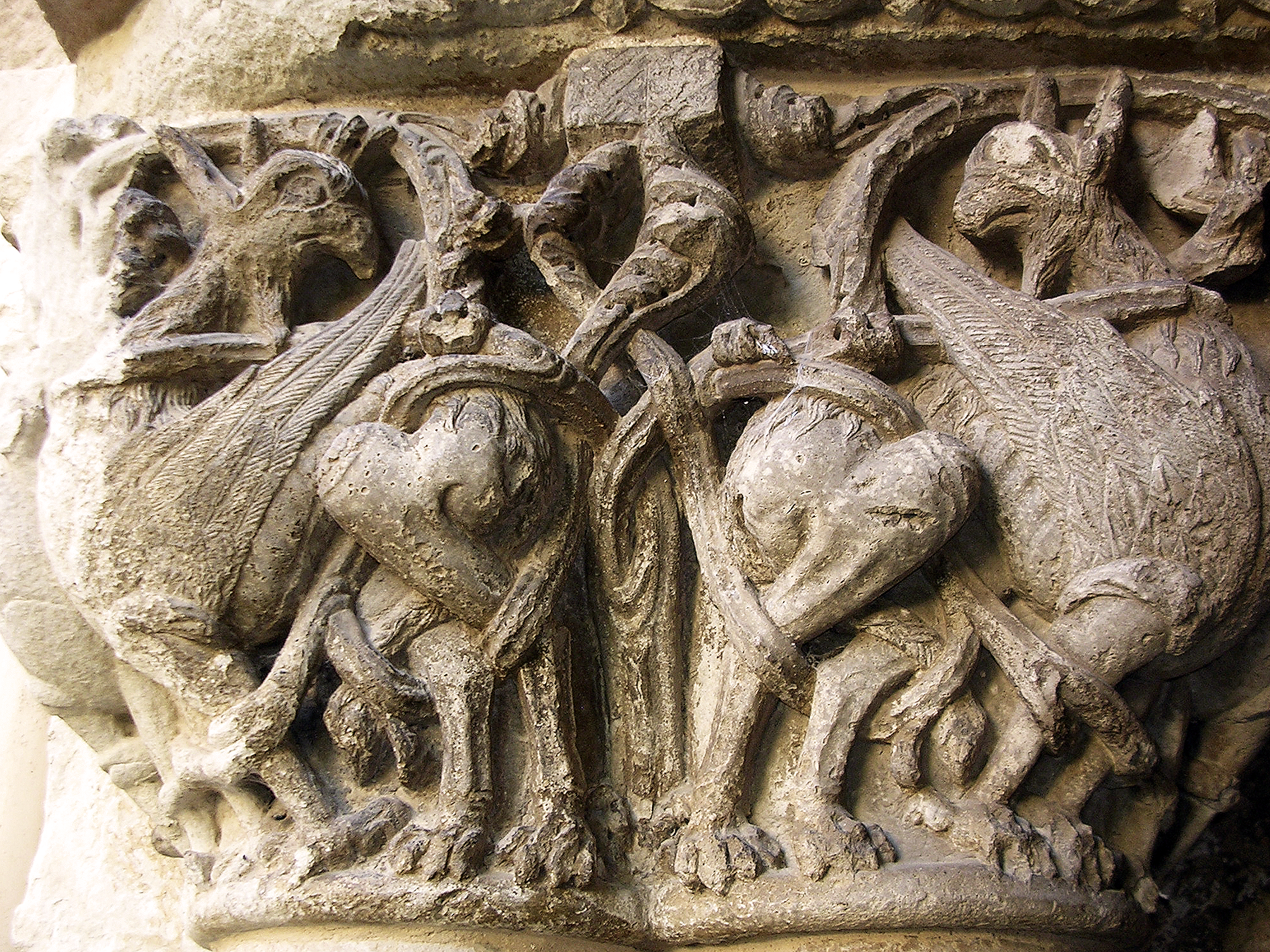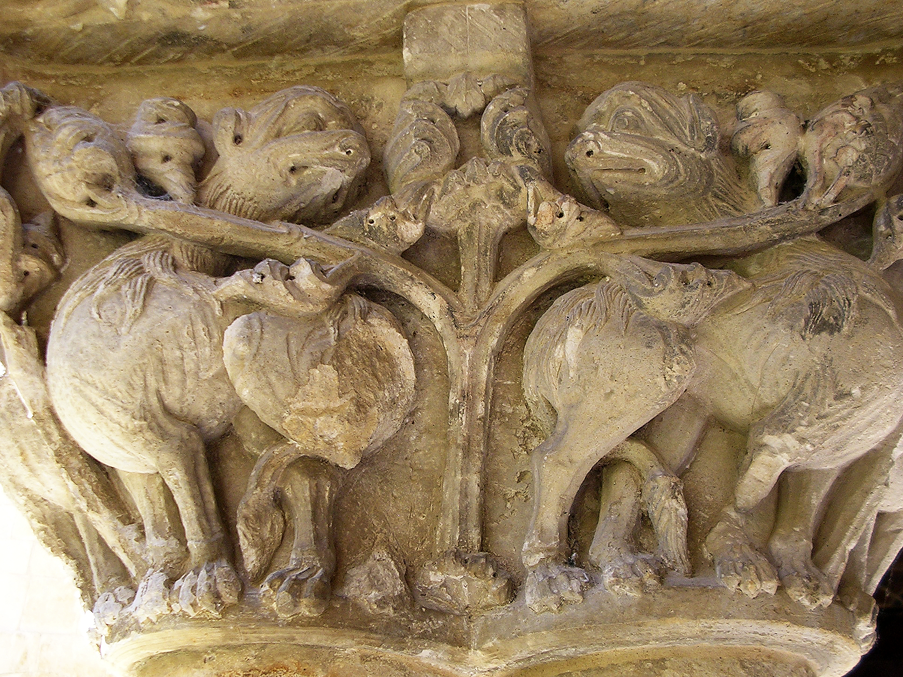 En este capitel, los dragones opuestos y afrontados, con el juego de cabezas rutinario, prevalecen sobre el ornato vegetal, reducido a unos árboles extremadamente simples.