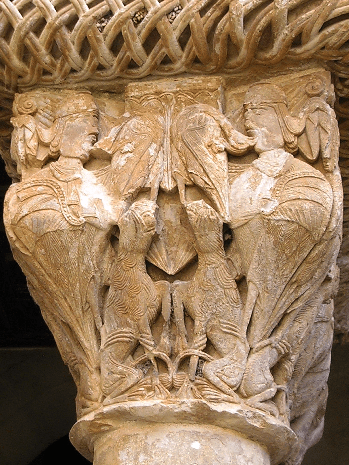 En la nueva perspectiva simbólica de esta segunda etapa del claustro, el águila se equipara a Cristo. Su vuelo alcanza una altura celestial y Cristo penetró en lo más alto del cielo cuando marcha junto al Padre. En este capitel, entrelazadas con el Árbol de la vida, las águilas-Cristo reafirman la inmortalidad de los bienaventurados.