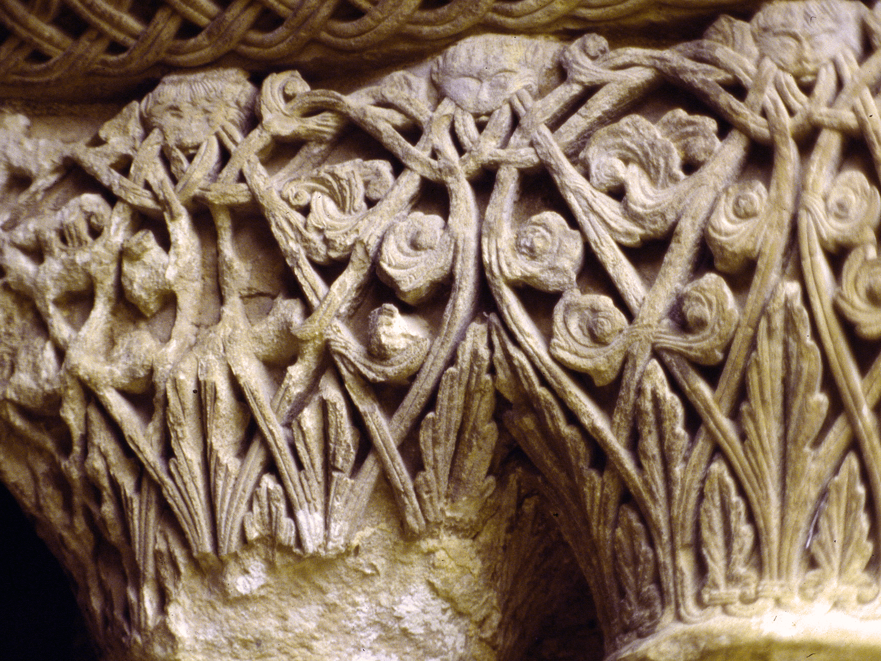 Se repiten las hojas superpuestas, con la salvedad de que algunas de las palmetas prestan un mayor realce al relieve, gracias a sus bordes curvados.