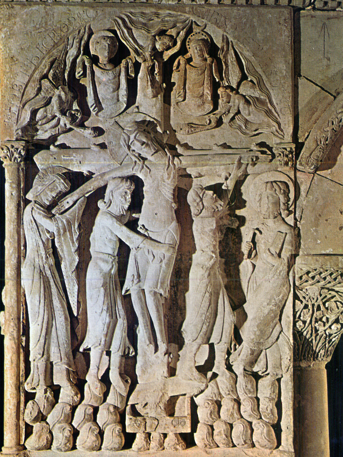 Entierro y Resurrección. La historia continúa, en el centro del relieve lindante, con el Entierro de Cristo. José de Arimatea y Nicodemo acomodan su cuerpo sobre una losa sepulcral recubierta por un lienzo. Una tapa en diagonal, formando ángulo con la losa, figura un sarcófago entreabierto; encuadra la escena del Entierro y define, juntamente con la losa, dos espacios, superior e inferior, dedicados a la Resurrección.