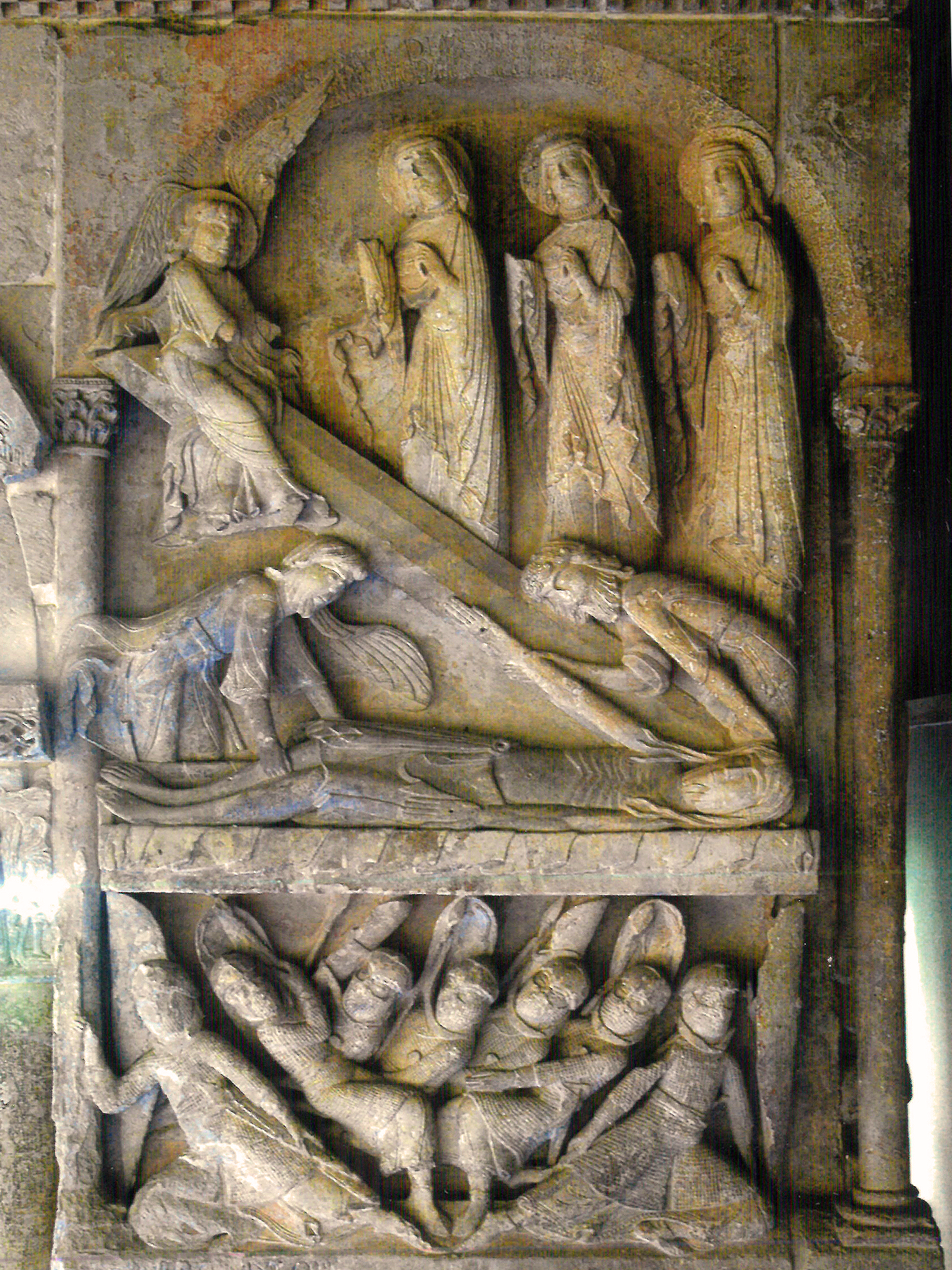 Debajo de la losa sepulcral surgen los soldados de la guardia de Pilato, deslumbrados, casi adormecidos. Visten la indumentaria del guerrero propia del siglo XI, y su actitud paralizada ante la presencia del ángel – “se quedaron como muertos”- responde literalmente al relato del evangelista Mateo.