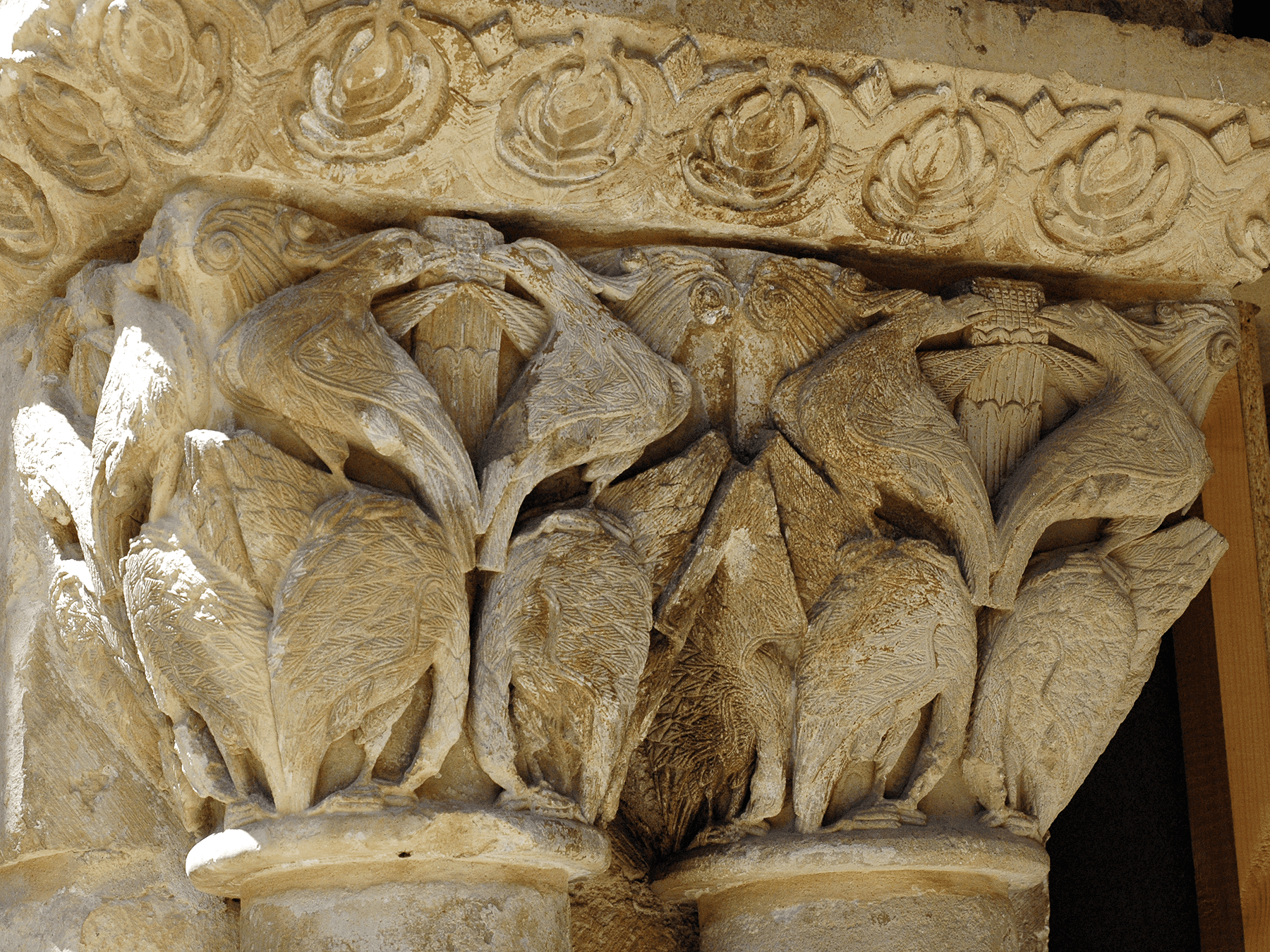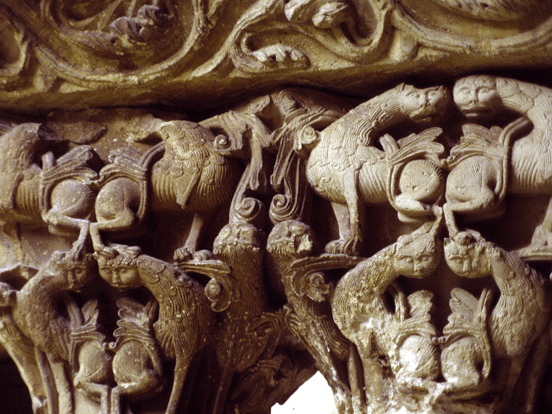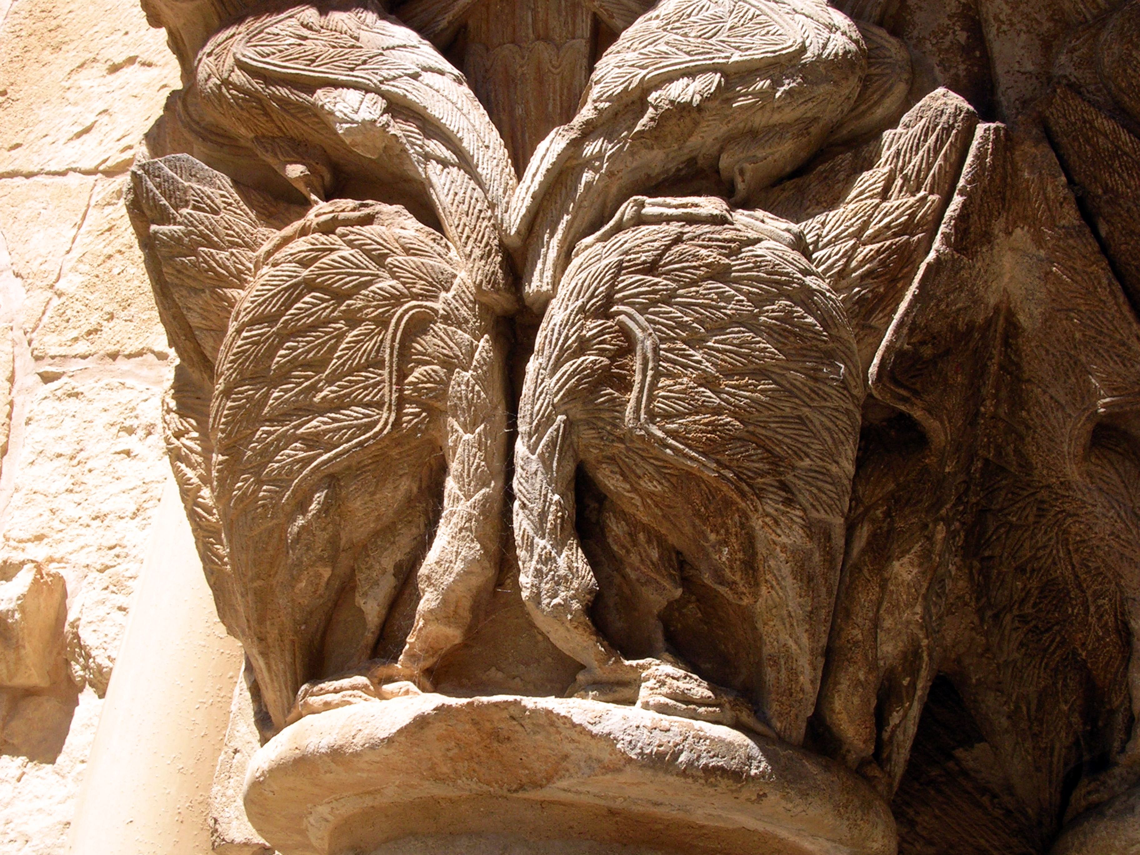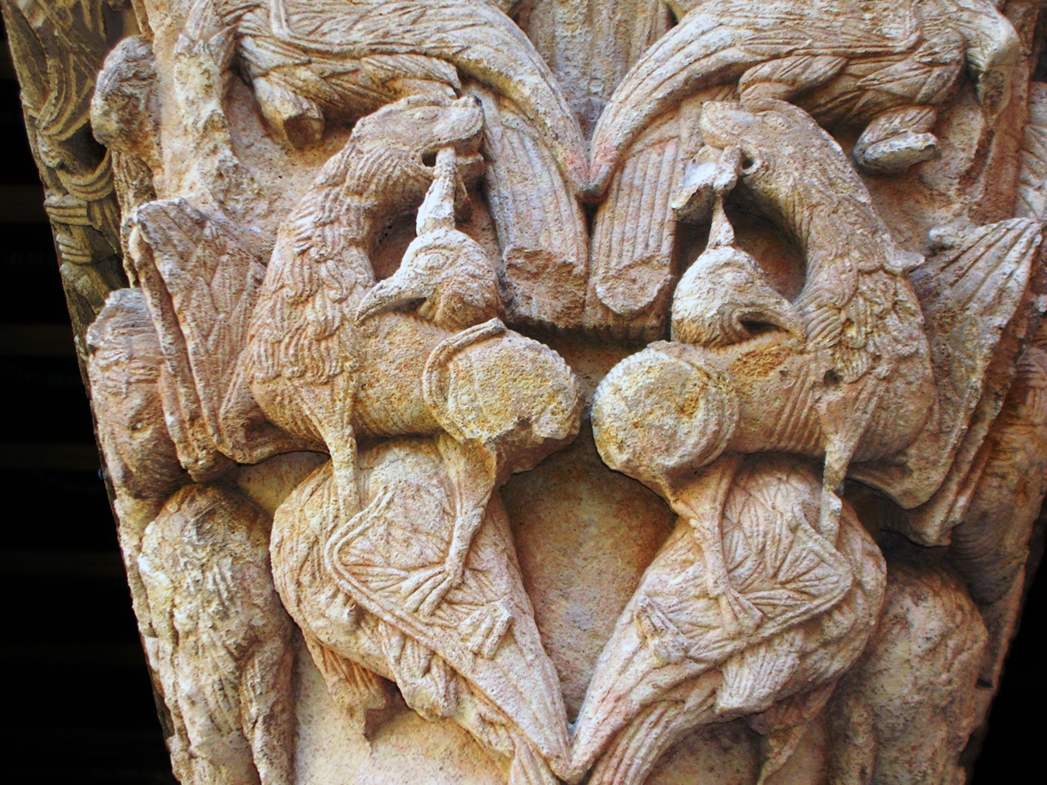 Es muy significativo que en el capitel del claustro, con la forzada torsión de sus cuellos, picoteen e invaliden las bocas de las sirenas como lugar del que surge la perdición.