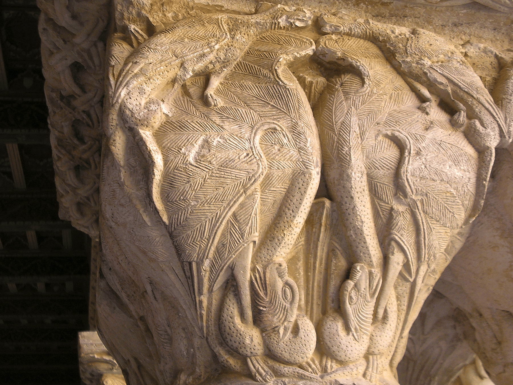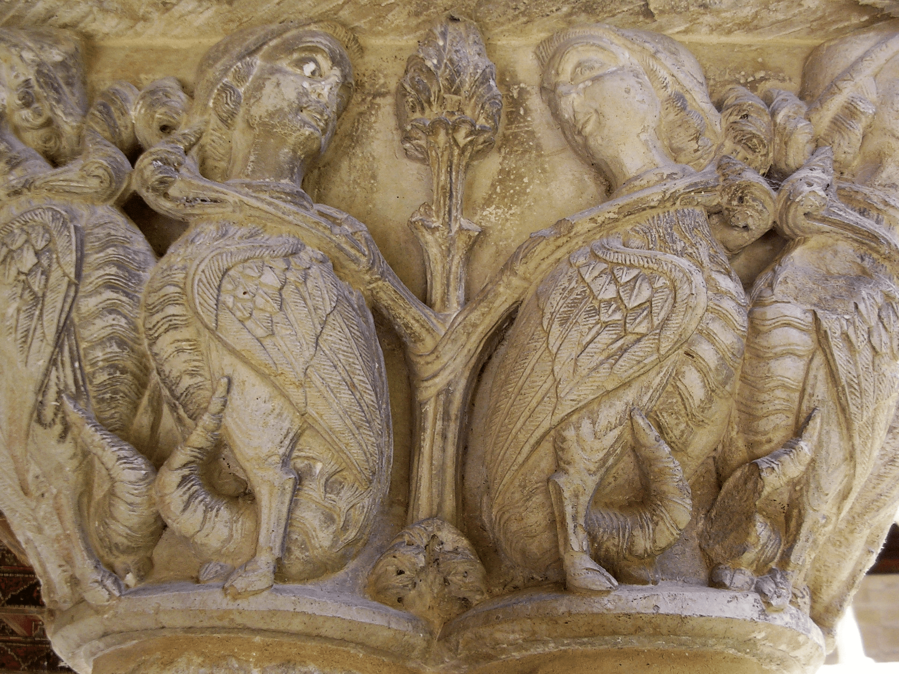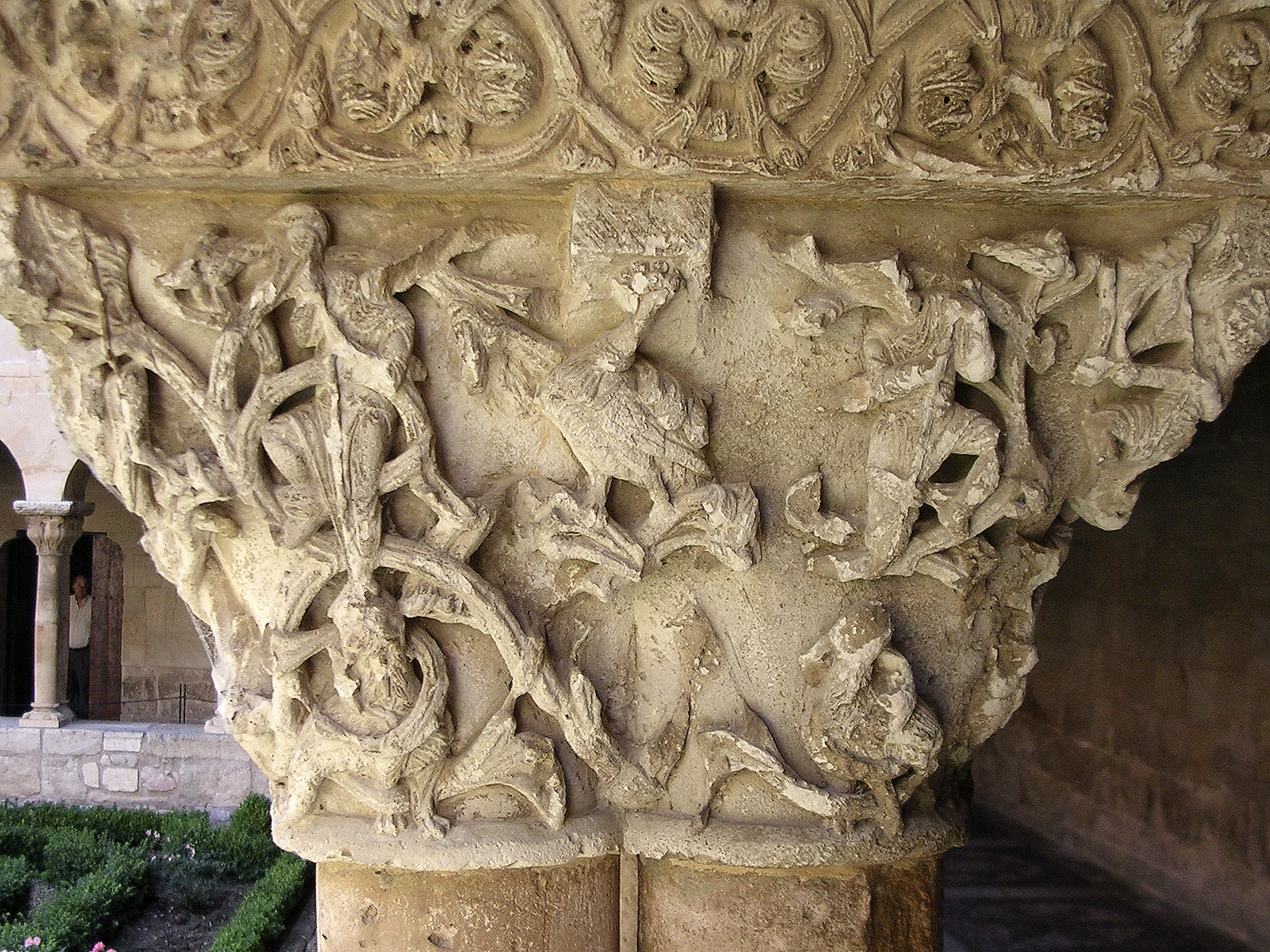 Es muy significativo que en el capitel del claustro, con la forzada torsión de sus cuellos, picoteen e invaliden las bocas de las sirenas como lugar del que surge la perdición.
