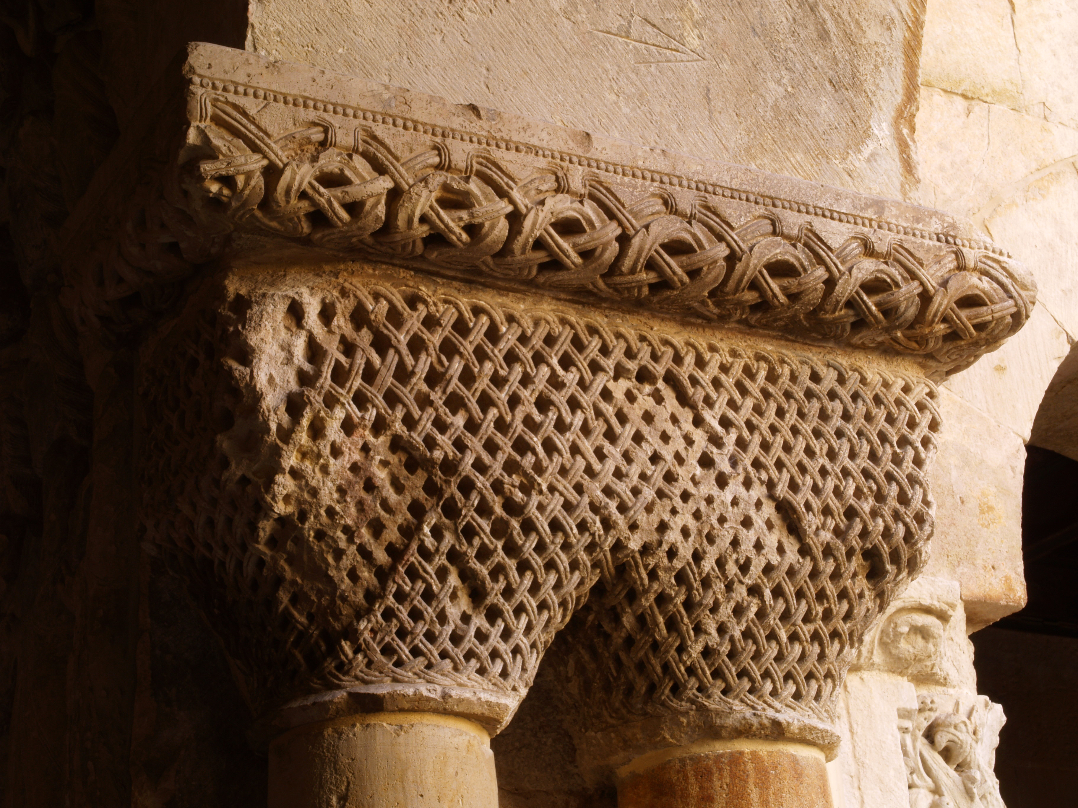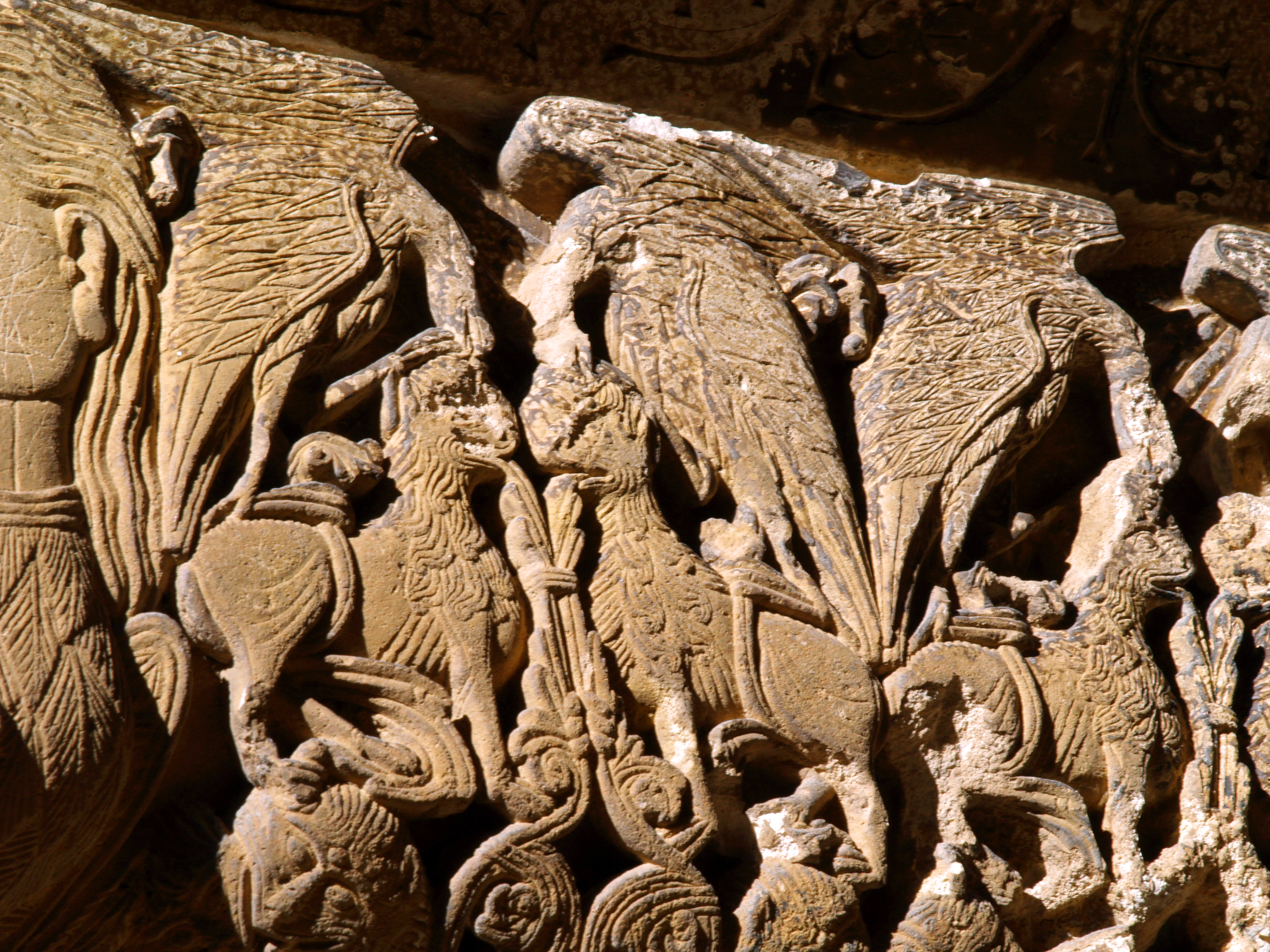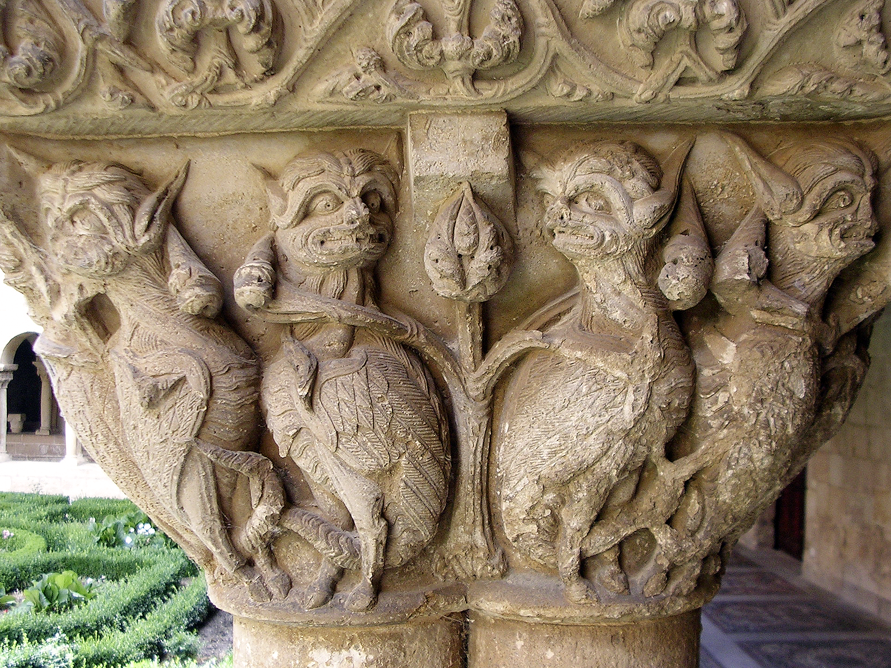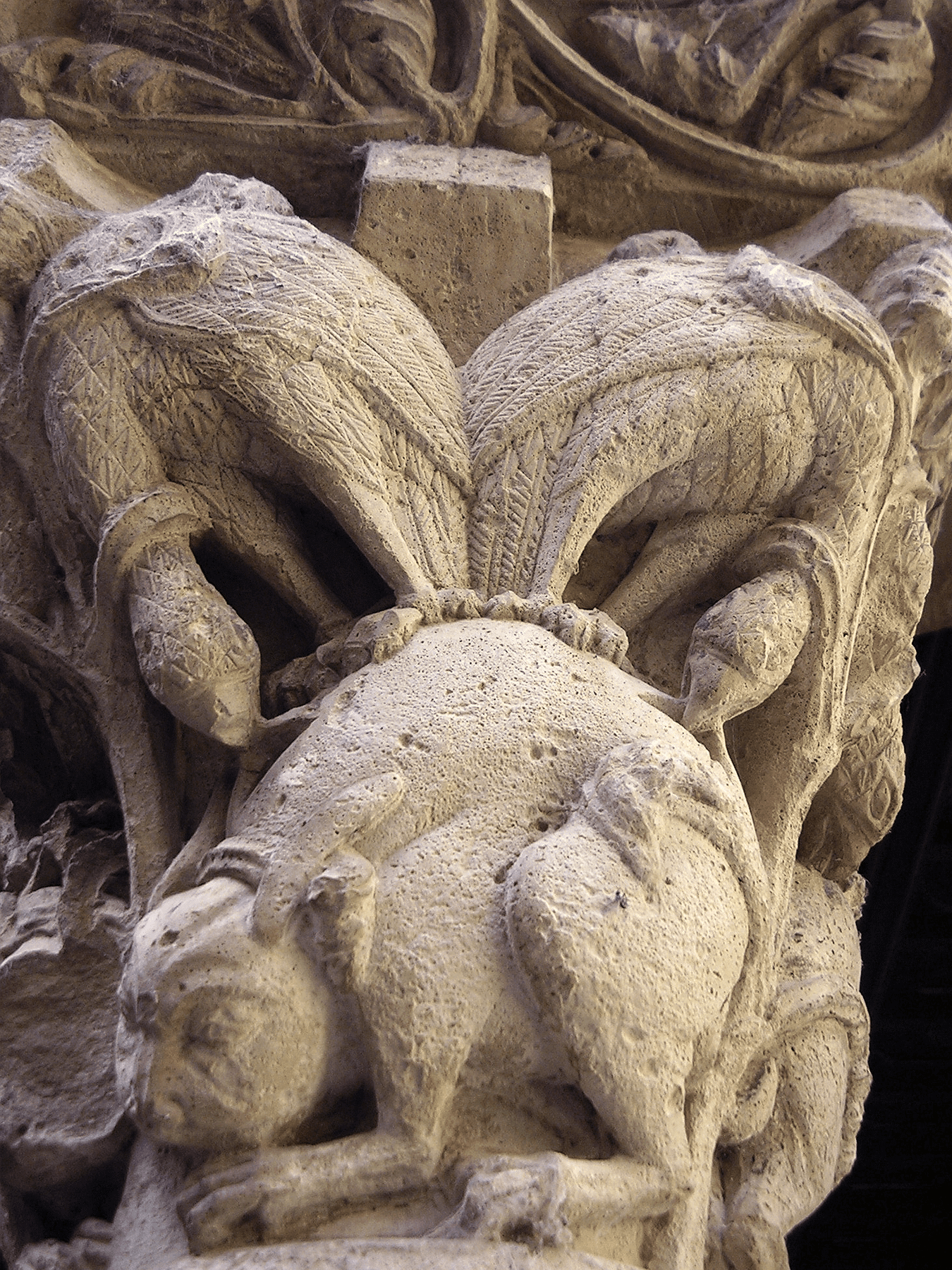 Es muy significativo que en el capitel del claustro, con la forzada torsión de sus cuellos, picoteen e invaliden las bocas de las sirenas como lugar del que surge la perdición.