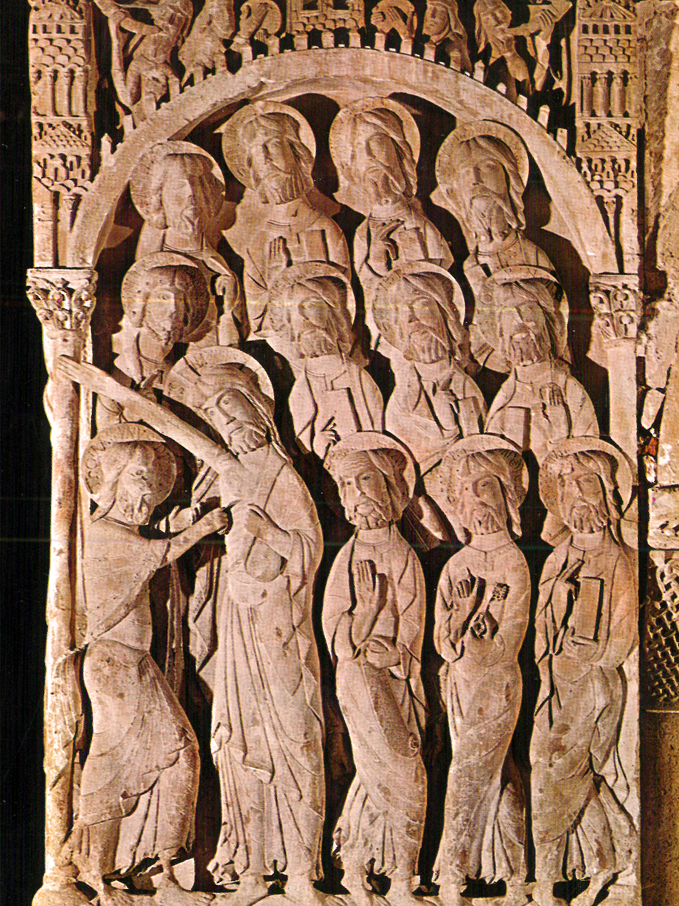En Pentecostés, por el contrario, acorde con su significado, prima el sentido descendente. Las nubes, también en lo alto del relieve, esta vez se descuelgan sobre las figuras, y envuelven una mano, emplazada justo en el centro, y a los ángeles adoradores de ambos lados. La mano, aquí en Silos, representa al Espíritu Santo y pende sobre el apostolado, dispuesto, como en la Ascensión, en dos hileras superpuestas. Nuevamente los halos de sus cabezas detallan sus respectivos nombres; también se incluye a Pablo, tras el apóstol Juan; y todos, en actitud de recogimiento, transmiten la recepción del Espíritu.