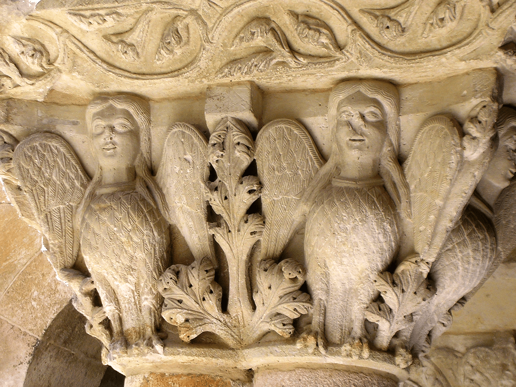 La fama de las sirenas procede de la Odisea; obra de Homero donde el autor las sitúa en la Isla de las Sirenas, entonando sus bellos cantos para atraer y matar a los navegantes. Sin describir su apariencia, esboza un ser femenino, peligroso en extremo, germen de una imagen malévola ligada a la seducción de la mujer. Y en los siglos XI Y XII se muestran en forma de ave con cabeza femenina, tal como aparecen en el capitel silense.