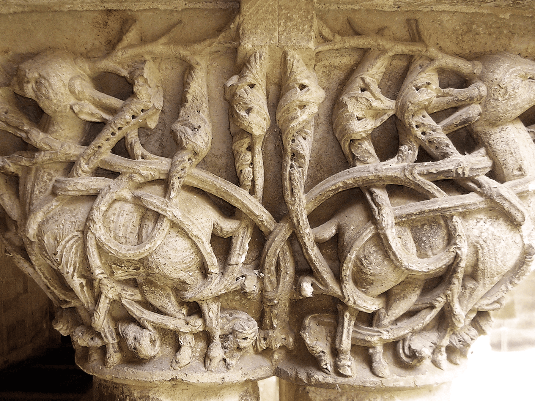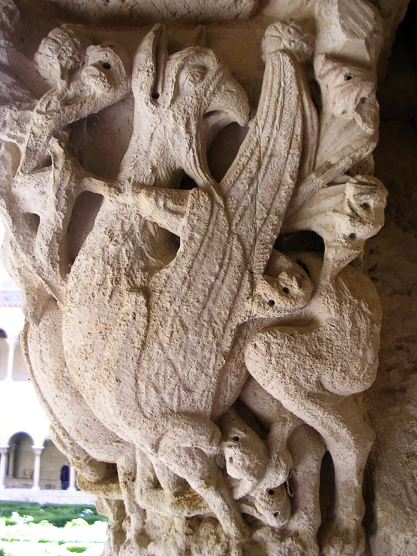 El capitel quíntuple, eje del ala oriental del claustro, exhibe el tema del dragón a través de dos tipos de reptil superpuestos y diferentes.