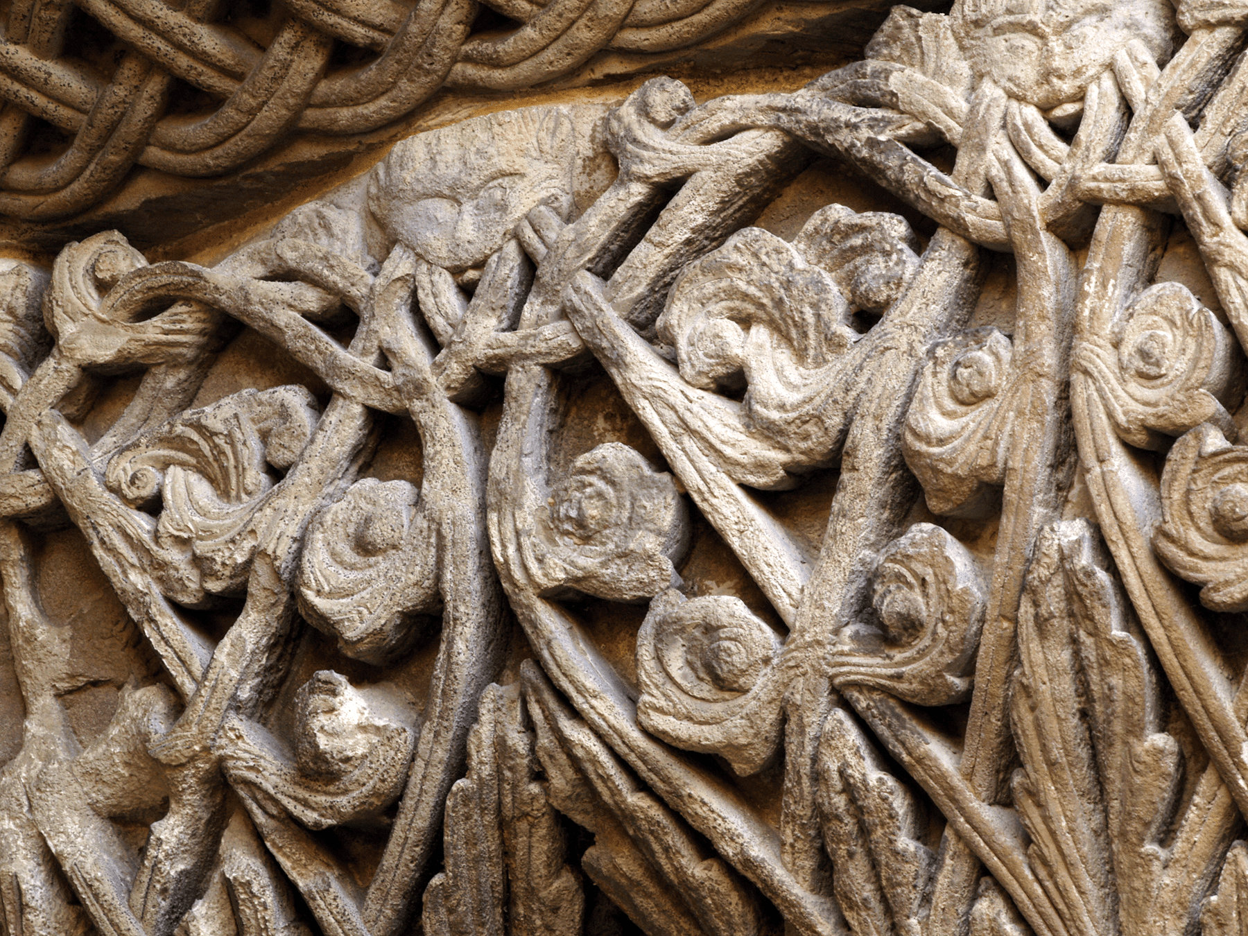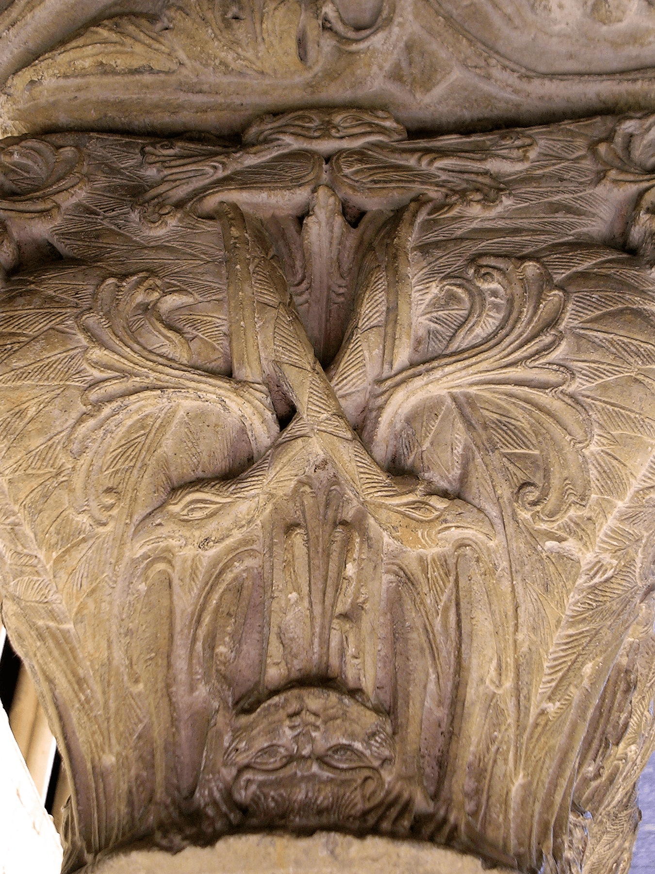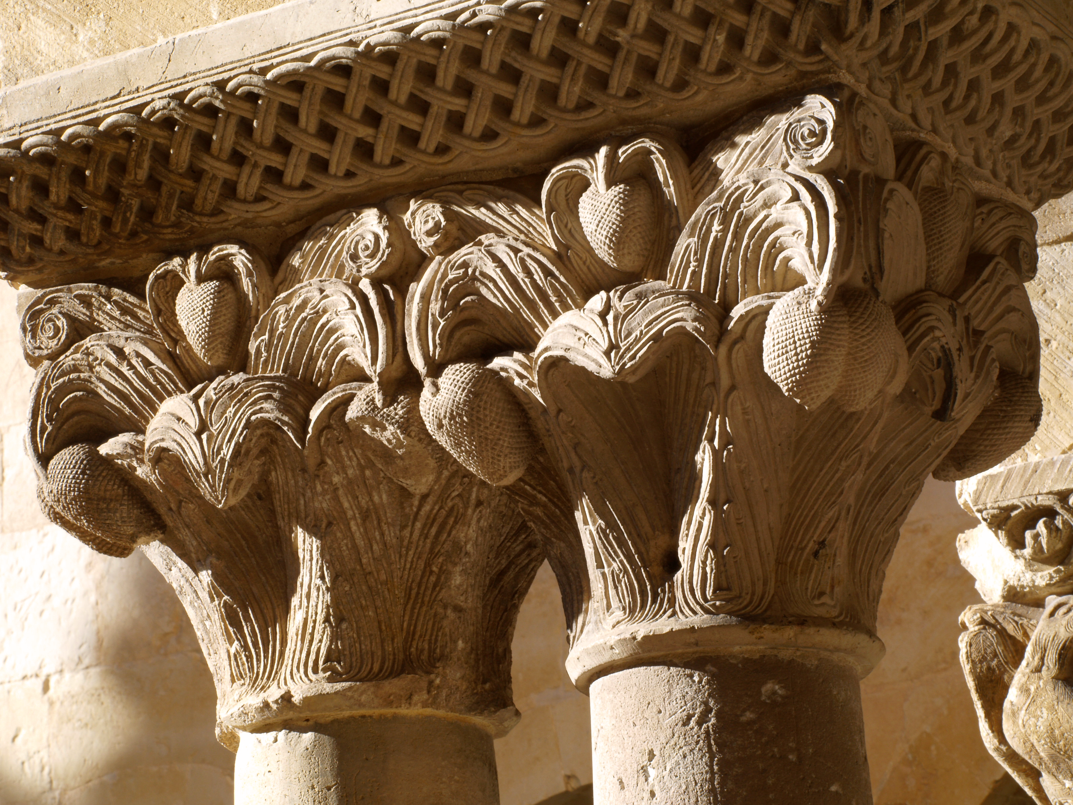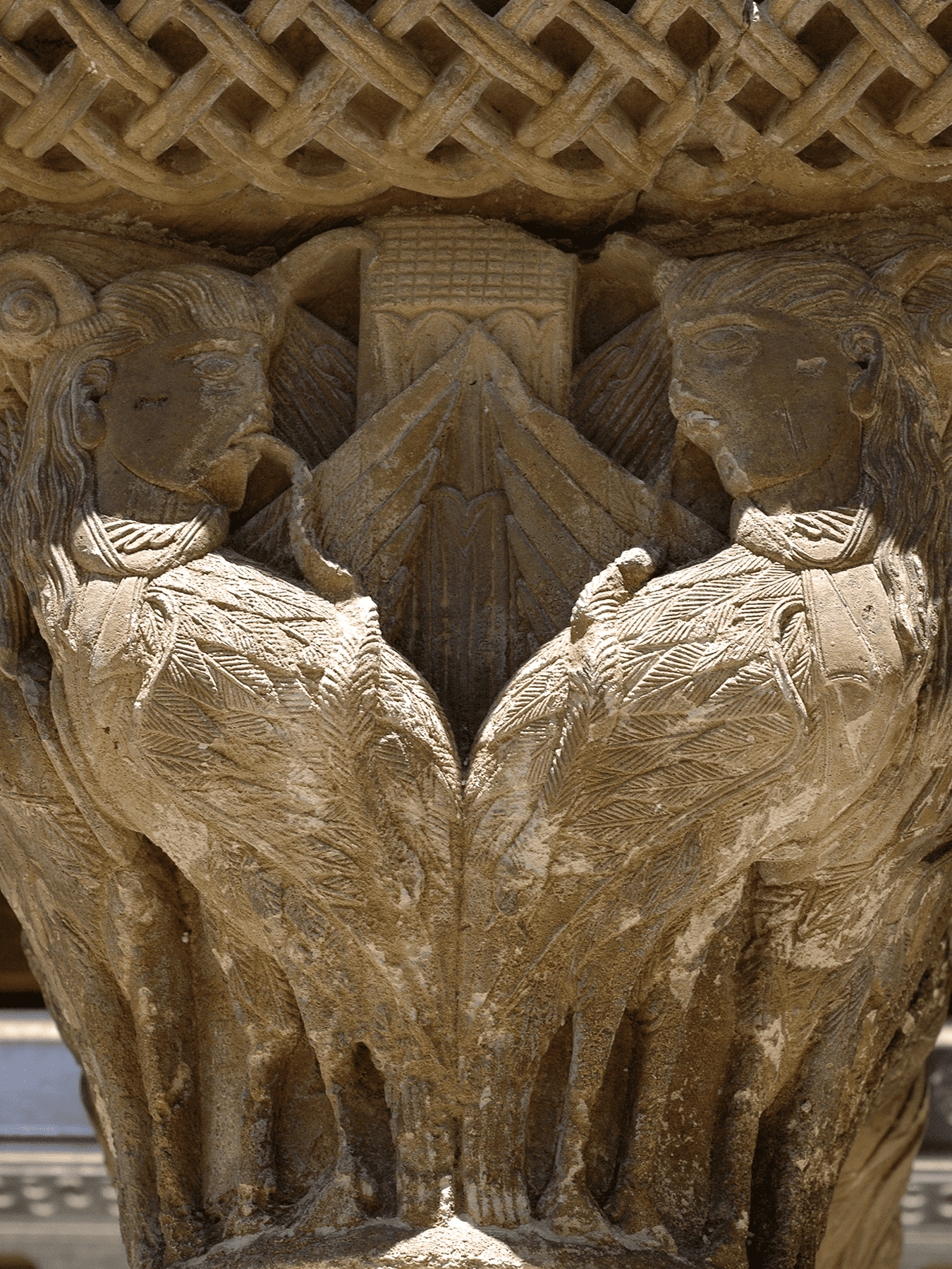 De las propias colas surgen los tallos que invaden el capitel, y entre las cabezas de los monstruos, a veces emerge el fruto de aro, gramíneo, similar a una piña.