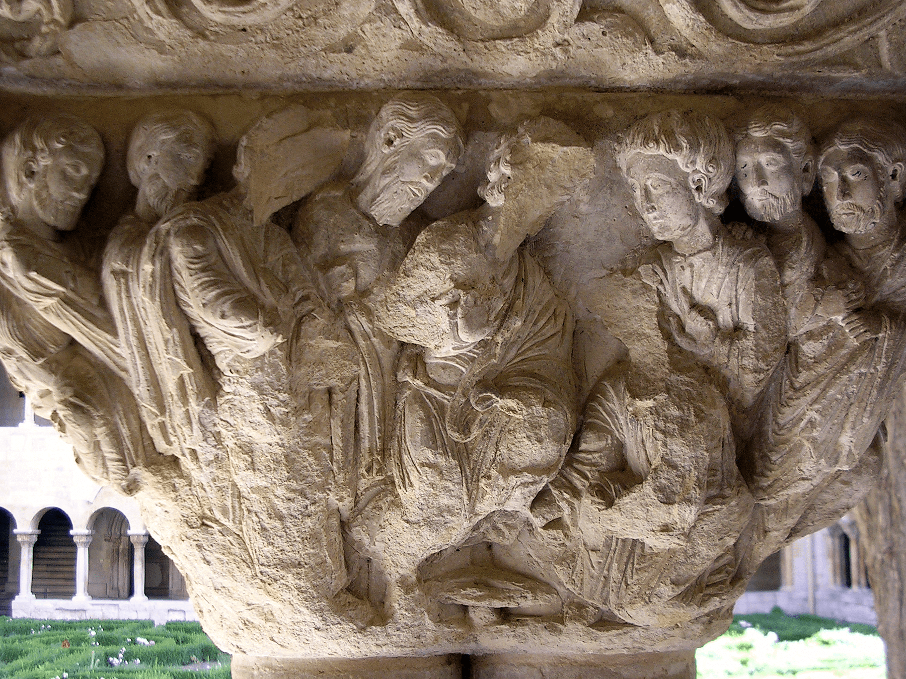 Con el capitel dedicado a la venida al mundo de Cristo irrumpe plásticamente una nueva etapa del claustro elaborada años más tarde, en la segunda mitad del S.XII. Y acompañado de inmediato, dos capiteles más allá, por escenas de la historia de la Pasión, constituyen ambos el único referente narrativo de los capiteles del claustro. Los nuevos arcos, al igual que los antiguos, se sustentan e insisten en el repertorio animal, con la salvedad de que abandona la explicación mítica, fabulosa, y se convierte en puro símbolo de la teología y la moral. Más no, por ello, dejan de aparecer con cierta frecuencia, atisbos de sus orígenes.