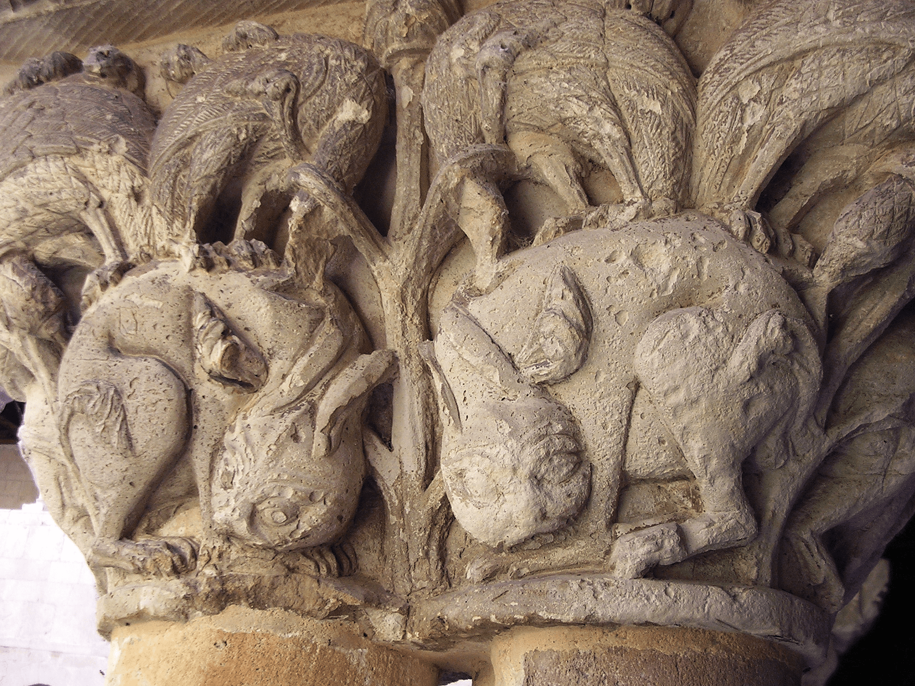 La liebre parece alumbrar, aquí en el relieve, el significado del águila y del capitel en su conjunto. La liebre, en la interpretación simbólica de la Edad Media, solía equipararse a la lujuria. Resurgía, así, el legado del Fisiólogo que atribuía su fecundidad, en extremo prolífica, a un apareamiento insaciable, sinónimo de lascivia.
