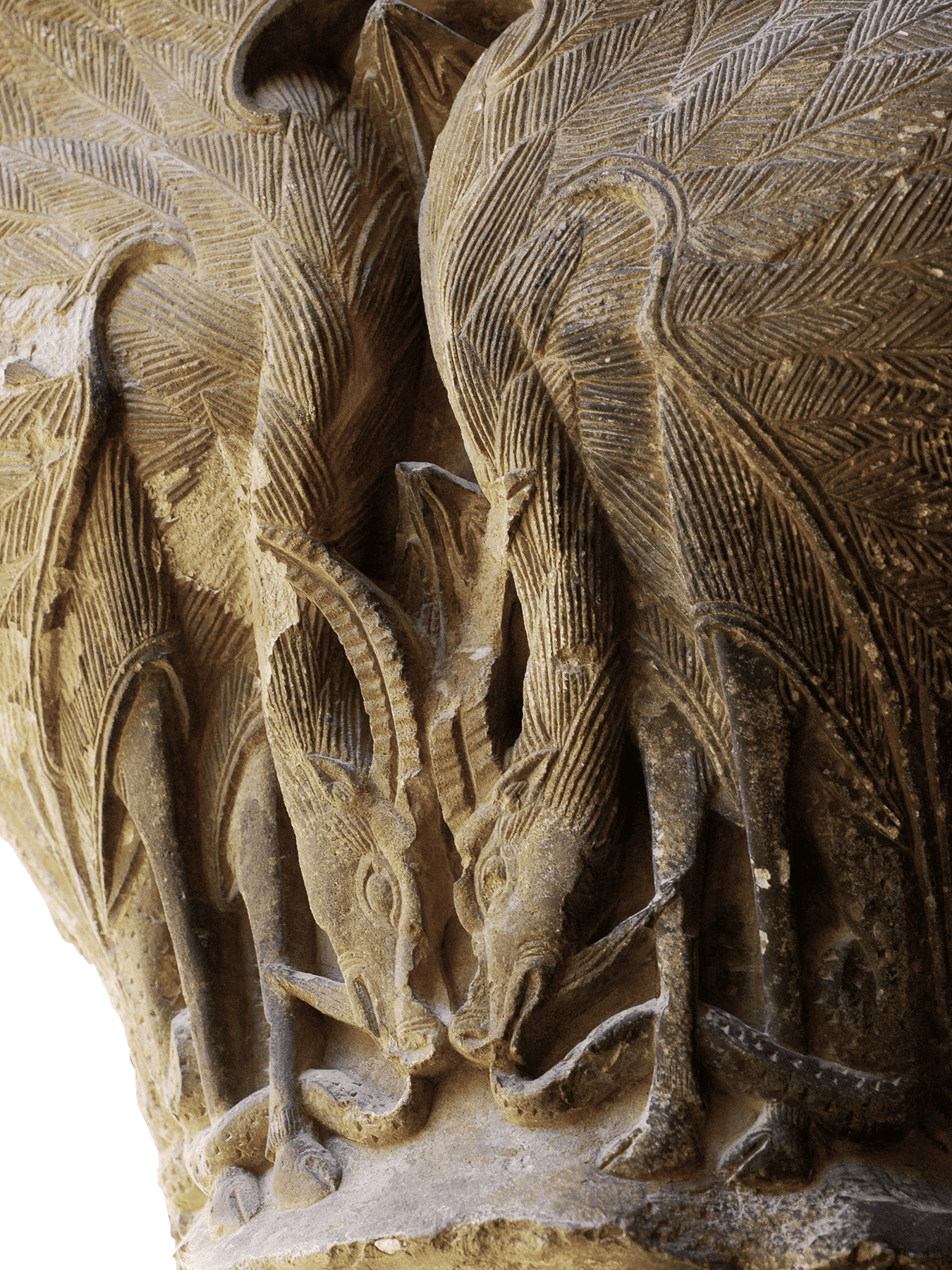 La misma plástica del capitel, con la imagen del ciervo semioculta por una trama vegetal, anuncia su proyección simbólica: los ciervos, labrados a la perfección en sus más mínimos detalles -cornamenta ramosa, colas cortas y pezuñas de ungulado-evocan, desde los primeros tiempos del cristianismo, al catecúmeno, al bautizado. La malla de hojas y tallos, que surge de un tronco posado en el astrágalo de las caras frontales del capitel y prende a los cérvidos en forma de meandros, barrunta el acoso de los vicios.