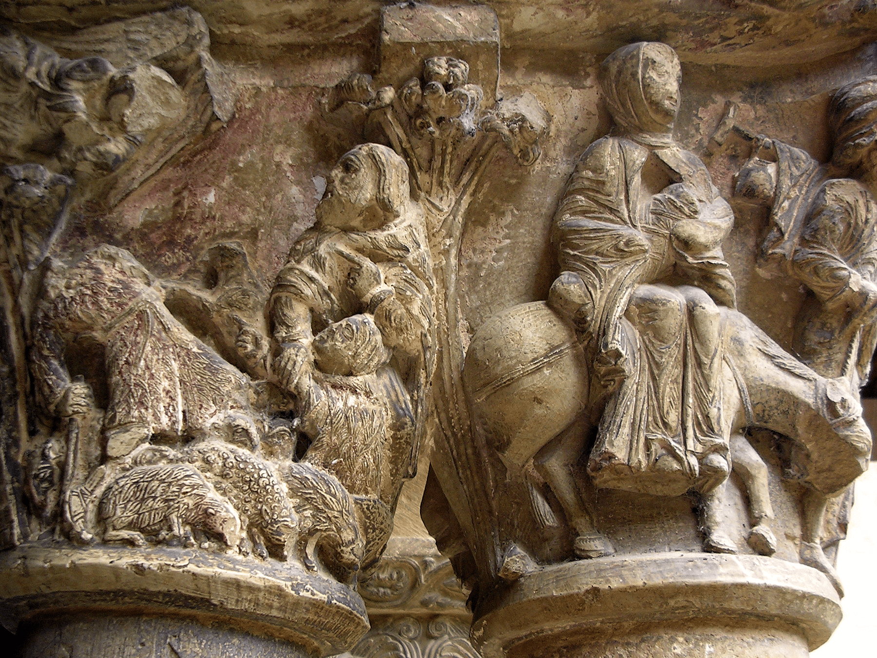 Asoma a continuación el Anuncio a los pastores, donde el artífice amontona ovejas y pastores, tres en concreto, sobrecogidos ante la aparición y anuncio del ángel, ahora apenas visible, desde lo alto de un arbusto; y sin interrupción alguna, es decir, sin la habitual Adoración de los Magos, cinceló la Huida a Egipto. María, sentada en el asno, ocupa el resto de la cara del capitel. Tocada con barboquejo, protege al Niño, enfajado, con su propio manto. Y José encabeza la comitiva sujetando el ronzal del jumento, mientras el animal, en un detalle anecdótico, intenta morderle una pierna. Con el cayado al hombro, del que pende un manto y un zurrón, manifiesta su condición de viajero, y semiesquinado, inmediato a la Anunciación, es la figura que cierra el ciclo.