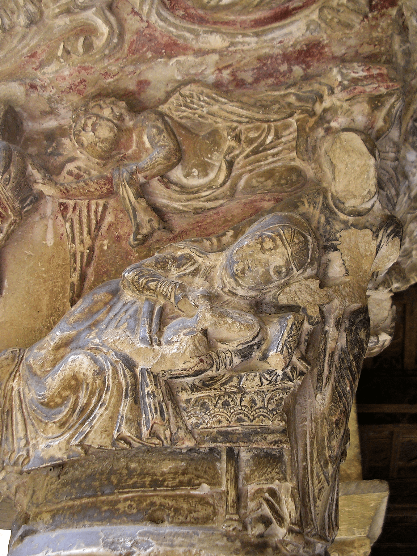 Aunque el deterioro de la piedra impide apreciar detalles, se percibe un tema de sirenas muy similar al del capitel 41.